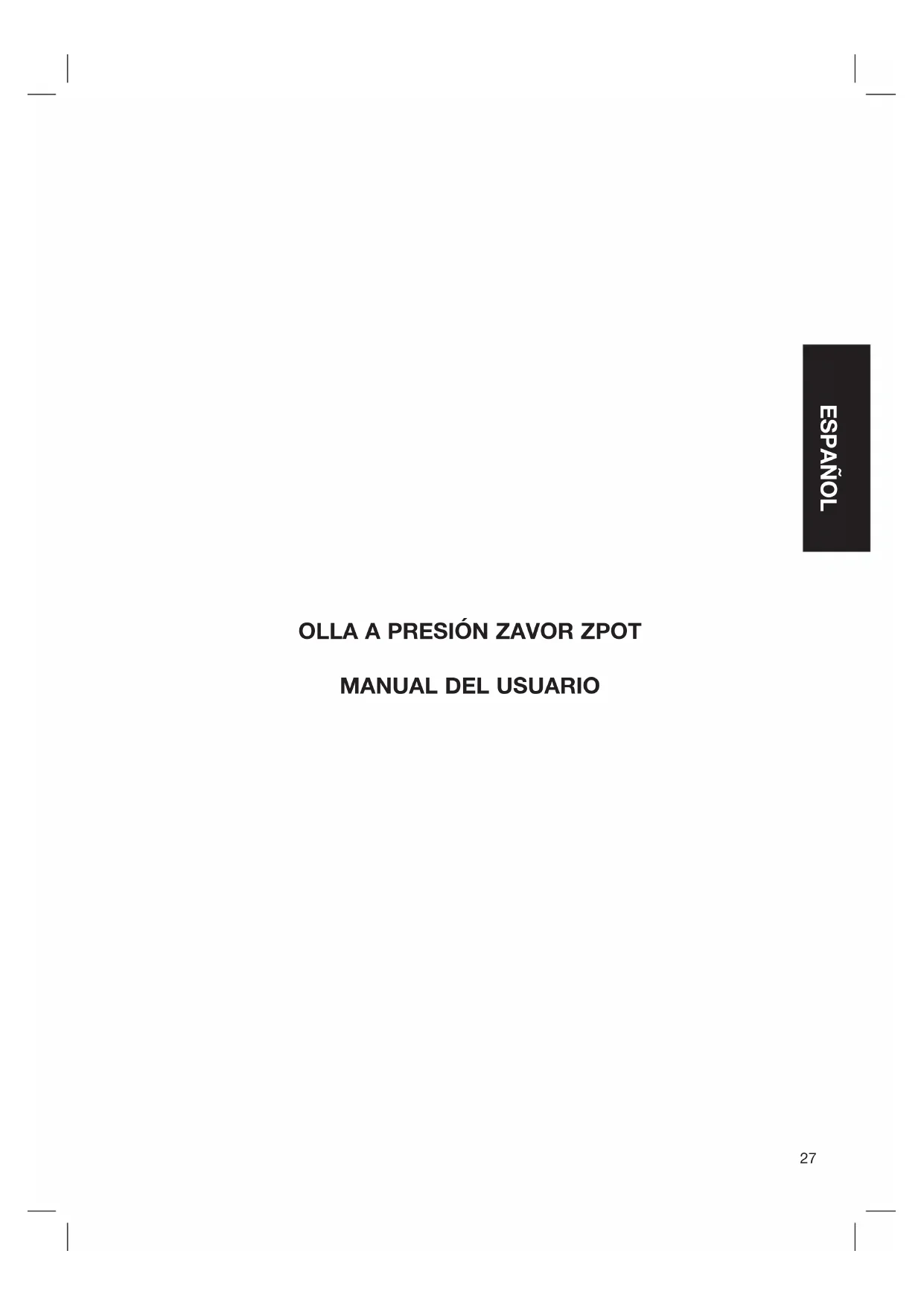 la olla a presión. Para disfrutar al máximo de su nueva olla a presión ZAVOR, por favor lea detenidamente estas recomendaciones antes de empezar a usarla, y sígalas con cuidado. Recomendaciones del Fabricante ESPAÑOLGracias por comprar una olla a presión ZAVOR. Apreciamos la confianza que ha depositado en nuestra empresa, eligiendo una de nuestras ollas a presión. Estamos seguros de que esta olla a presión le brin- dará un excelente servicio durante años. Rodeada de innumerables mitos, la olla a presión es probablemente la menos comprendida de las piezas de cocina. Esto es lamentable, porque la olla a presión aporta muchas ventajas respecto a los métodos de cocción tradicionales. Lo primero y más importante, es que cocina los alimentos en mucho menos tiempo, en la mayoría de los casos en un tercio del tiempo requerido habitualmente. Al reducirse el tiem- po para cocinar los alimentos, estos tienden a conservar mejor el color y el sabor, así como las vitaminas y minerales, que habitualmente se evaporan o diluyen al cocinar con más agua y durante más tiempo. Fabricadas de acero inoxidable 18/10 de alta calidad y grueso calibre, las ollas a presión de ZAVOR están diseñadas pensando en su funcionalidad y seguridad, ya que cumplen con todas las normas de seguridad internacionales. El regulador de presión incorporado y fácil de usar de ZAVOR, hace que determinar la presión correcta y el mantenimiento de la misma sea más fácil que nunca. Sabemos que una vez haya utilizado una olla a presión ZAVOR, esta se convertirá en la pieza de cocina más importante que haya tenido. Hoy en día, se tiene en cuenta que la comida y los productos que se consumen afectan al medioam- biente. ZAVOR reconoce una demanda de productos y procesos de producción respetables con el medioambiente. Las ollas a presión de ZAVOR están fabricadas, en parte, con acero inoxidable reciclado, y el acabado final en brillo se consigue a través de procesos mecánicos en lugar de químicos. Además de estar fabricadas de una manera respetuosa con el medioambiente, las ollas a presión ahorran energía. Cocinar con una olla a presión le ahorrará hasta un 70% del tiempo de cocinado, en comparación con los métodos tradicionales. Al cocinar en menos tiempo se consume menos energía. Además el cocinar a altas temperaturas y con tanta velocidad, retiene mejor las vitaminas y minerales de los alimentos, haciendo sus comidas más saludables. Utilizando las ollas a presión de ZAVOR, además de marcar la diferencia en su salud, lo hará en el Mundo. Esta será probablemente la pieza más eficiente en su cocina. Antes de que empiece a cocinar, es importante que lea detenidamente este manual y que se asegure de comprender el funcionamiento, cuidado y mantenimiento de su olla a presión ZAVOR, para que pueda disfrutarla durante muchos años. Para conocer más acerca de nuestros productos, por favor visite nuestra Web www.zavoramerica.com Introducción Línea de ollas a presión ZAVOR ZPOT