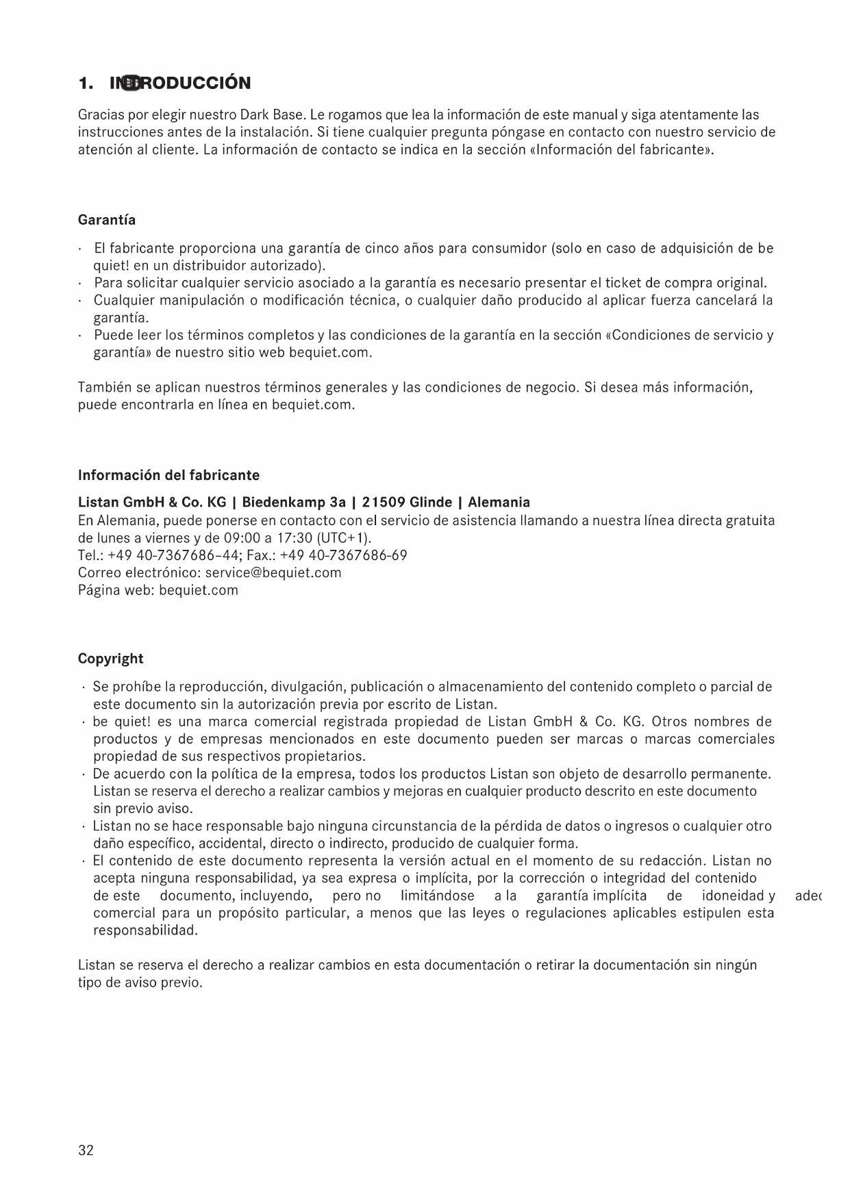 Gracias por elegir nuestro Dark Base. Le rogamos que lea la información de este manual y siga atentamente las instrucciones antes de la instalación. Si tiene cualquier pregunta póngase en contacto con nuestro servicio de atención al cliente. La información de contacto se indica en la sección «Información del fabricante». Garantía ∙ El fabricante proporciona una garantía de cinco años para consumidor (solo en caso de adquisición de be quiet! en un distribuidor autorizado). ∙ Para solicitar cualquier servicio asociado a la garantía es necesario presentar el ticket de compra original. ∙ Cualquiermanipulaciónomodicacióntécnica,ocualquierdañoproducidoalaplicarfuerzacancelarála garantía. ∙ Puede leer los términos completos y las condiciones de la garantía en la sección «Condiciones de servicio y garantía» de nuestro sitio web bequiet.com. Tambiénseaplicannuestrostérminosgeneralesylascondicionesdenegocio.Sideseamásinformación, puede encontrarla en línea en bequiet.com. Información del fabricante Listan GmbH & Co. KG | Biedenkamp 3a | 21509 Glinde | Alemania En Alemania, puede ponerse en contacto con el servicio de asistencia llamando a nuestra línea directa gratuita de lunes a viernes y de 09:00 a 17:30 (UTC+1). Tel.: +49 40-7367686–44; Fax.: +49 40-7367686-69 Correo electrónico: service@bequiet.com Páginaweb:bequiet.com Copyright ∙ Se prohíbe la reproducción, divulgación, publicación o almacenamiento del contenido completo o parcial de este documento sin la autorización previa por escrito de Listan. ∙ be quiet! es una marca comercial registrada propiedad de Listan GmbH & Co. KG. Otros nombres de productos y de empresas mencionados en este documento pueden ser marcas o marcas comerciales propiedad de sus respectivos propietarios. ∙ De acuerdo con la política de la empresa, todos los productos Listan son objeto de desarrollo permanente. Listan se reserva el derecho a realizar cambios y mejoras en cualquier producto descrito en este documento sin previo aviso. ∙ Listan no se hace responsable bajo ninguna circunstancia de la pérdida de datos o ingresos o cualquier otro dañoespecíco,accidental,directooindirecto,producidodecualquierforma. ∙ El contenido de este documento representa la versión actual en el momento de su redacción. Listan no acepta ninguna responsabilidad, ya sea expresa o implícita, por la corrección o integridad del contenido deeste documento,incluyendo, perono limitándose ala garantíaimplícita de idoneidady adecuación comercial para un propósito particular, a menos que las leyes o regulaciones aplicables estipulen esta responsabilidad. Listan se reserva el derecho a realizar cambios en esta documentación o retirar la documentación sin ningún tipo de aviso previo.32 33