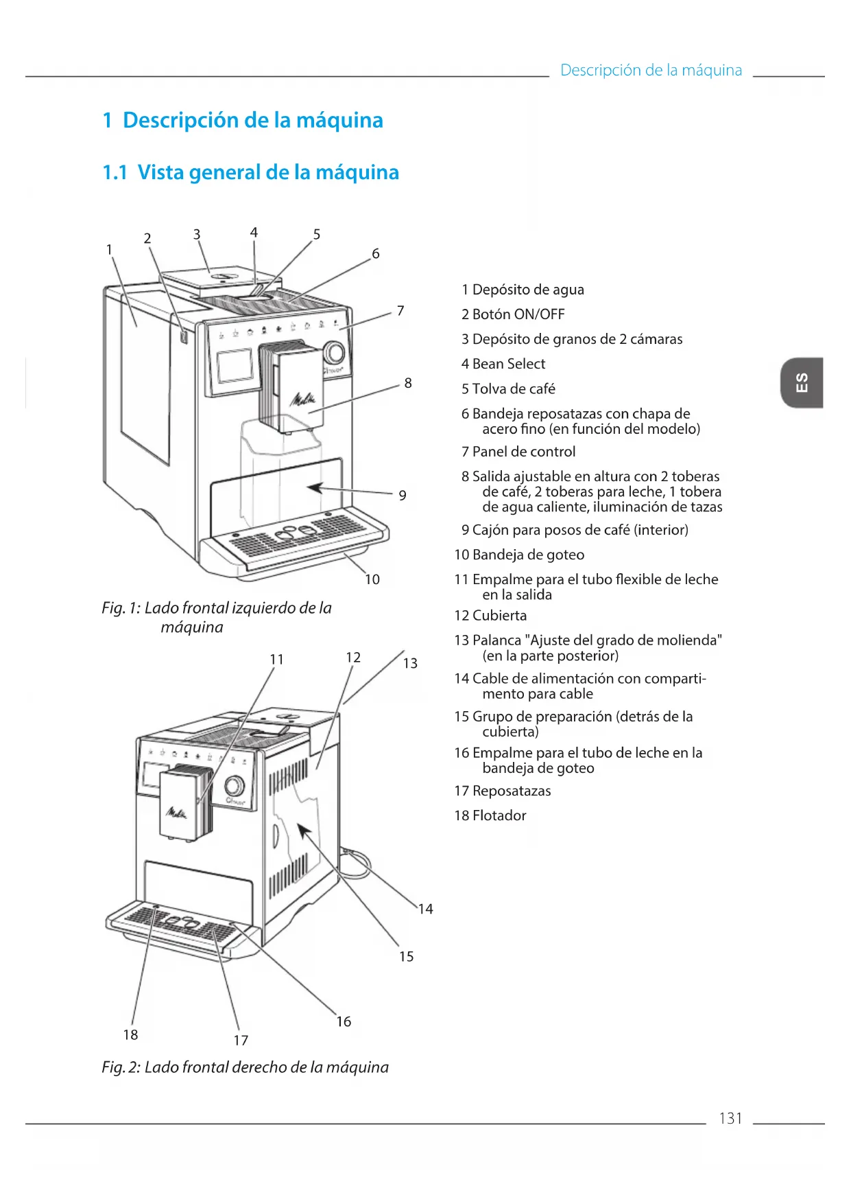 Fig. 2: Lado frontal derecho de la máquina 1 Depósito de agua 2 Botón ON/OFF 3 Depósito de granos de 2 cámaras 4 Bean Select 5 Tolva de café 6 Bandeja reposatazas con chapa de acero no (en función del modelo) 7 Panel de control 8 Salida ajustable en altura con 2 toberas de café, 2 toberas para leche, 1 tobera de agua caliente, iluminación de tazas 9 Cajón para posos de café (interior) 10 Bandeja de goteo 11 Empalme para el tubo exible de leche en la salida 12 Cubierta 13 Palanca "Ajuste del grado de molienda" (en la parte posterior) 14 Cable de alimentación con comparti- mento para cable 15 Grupo de preparación (detrás de la cubierta) 16 Empalme para el tubo de leche en la bandeja de goteo 17 Reposatazas 18 FlotadorDescripción de la máquina
