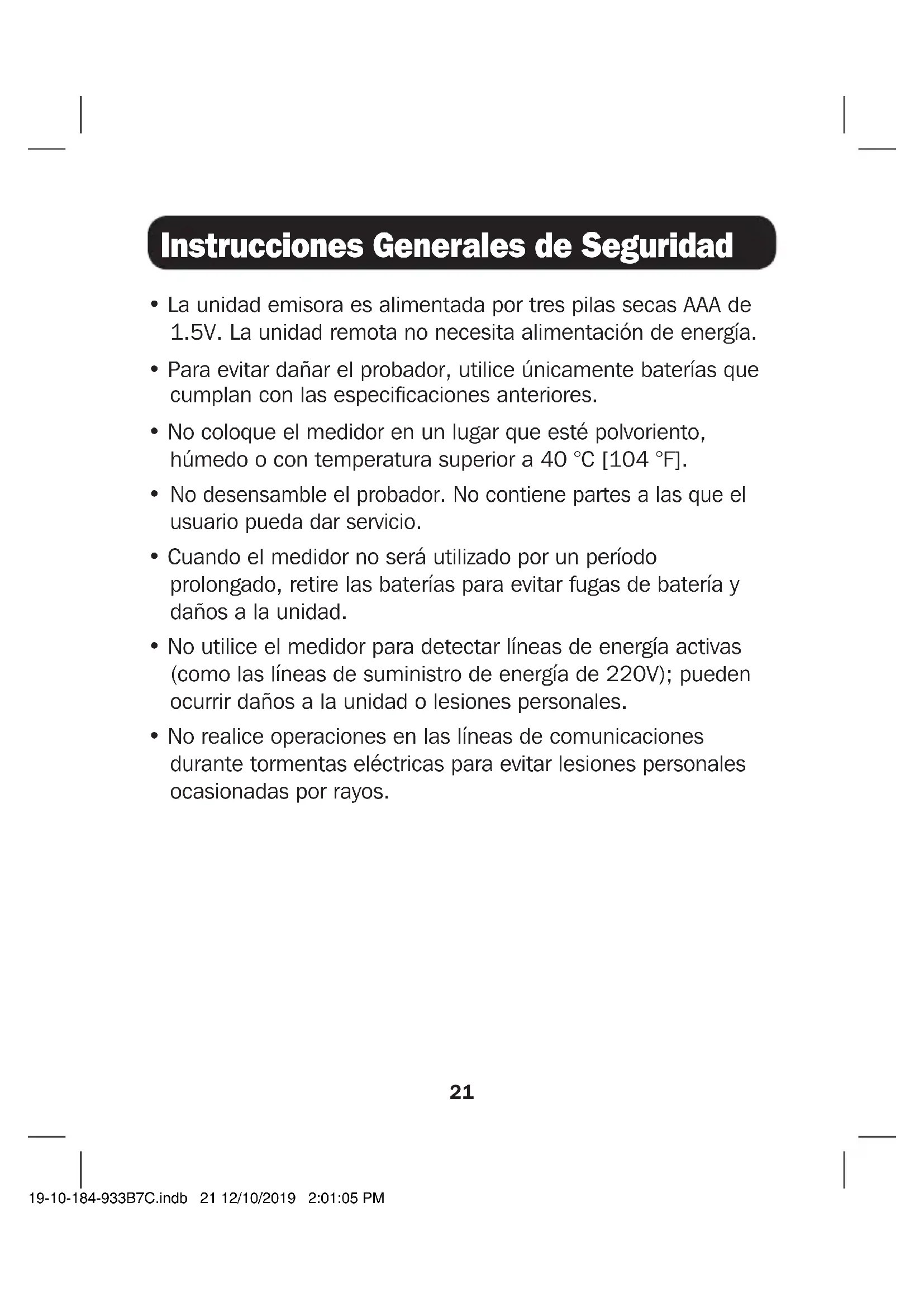No desensamble el probador. No contiene partes a las que el usuario pueda dar servicio.