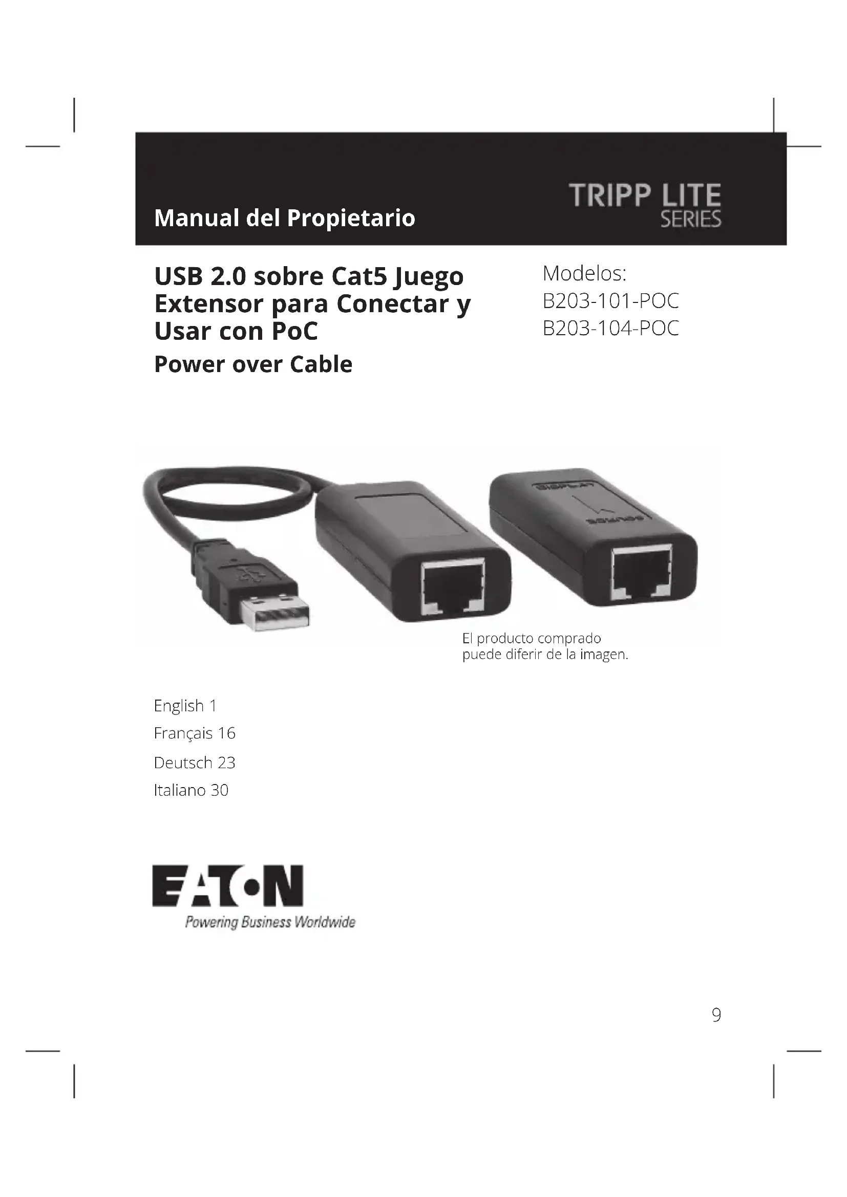 - Al conectar el receptor a dispositivos de alta potencia, agregue alimentación externa mediante su puerto USB Micro-B.13 Especicaciones Especicación B203-101-POC B203-104-POC Versiones de USB Soportadas USB 2.0 (480 Mbps), USB 1.1 (12 Mbps) Puertos del Transmisor (x1) RJ45 Puertos del Receptor (x1) RJ45 ; (x1) USB-A ; (x1) USB Micro-B (x1) RJ45 ; (x4) USB-A ; (x1) USB Micro-B Clavija del Transmisor USB-A Distancia Máxima de Extensión 50 m [164 pies] Temperatura de Operación 0 °C a 50 °C [32 °F a 122 °F] Temperatura de Almacenamiento -20 °C a 70 °C [-4 °F a 158 °F] Dimensiones del Transmisor (Al x An x Pr) 15 x 365 x 26 mm [0.59"x 14.36" x 1.02"] Dimensiones del Receptor (Al x An x Pr) 15 x 60 x 26 mm [0.59" x 2.36" x 1.02"] 50 x 26 x 62 mm [1.95" x 1.00" x 2.42"]14 Garantía Limitada por 1 Año Garantizamos por un (1) año a partir de la fecha de compra inicial que nuestros productos no presentan defectos de materiales ni de mano de obra. Nuestra obligación bajo esta garantía está limitada a la reparación o reemplazo (a su entera discreción) de cualquier producto defectuoso. Antes de devolver cualquier equipo para reparación, visite Tripplite.Eaton.com/support/product-returns. Esta garantía no se aplica a equipos que hayan sido dañados por accidente, negligencia o mal uso, o hayan sido alterados o modicados de alguna manera. SALVO POR LO QUE SE INDICÓ AQUÍ, NO OTORGAMOS GARANTÍAS EXPRESAS O IMPLÍCITAS, INCLUIDAS GARANTÍAS DE COMERCIABILIDAD Y ADECUACIÓN PARA UN PROPÓSITO PARTICULAR. Algunos estados no permiten la limitación o exclusión de garantías implícitas; por lo tanto, las limitaciones o exclusiones antes mencionadas pueden no aplicarse al comprador. SALVO POR LO QUE SE INDICÓ ANTERIORMENTE, EN NINGÚN CASO SEREMOS RESPONSABLES POR DAÑOS DIRECTOS, INDIRECTOS, ESPECIALES, INCIDENTALES O CONSECUENTES QUE SURJAN DEL USO DE ESTE PRODUCTO, INCLUSO SI SE ADVIERTE SOBRE LA POSIBILIDAD DE TAL DAÑO. Especícamente, no somos responsables por ningún costo, como pérdida de ganancias o ingresos, pérdida de equipos, pérdida del uso de equipos, pérdida de software, pérdida de datos, costos de sustituciones, reclamos de terceros o de cualquier otra forma. Garantía15 Información de Cumplimiento de WEEE para Clientes y Recicladores (Unión Europea) Conforme a la Directiva de Residuos de Equipos Eléctricos y Electrónicos (WEEE) y regulaciones aplicables, al adquirir un equipo eléctrico y electrónico nuevo de Eaton, los clientes están obligados a: