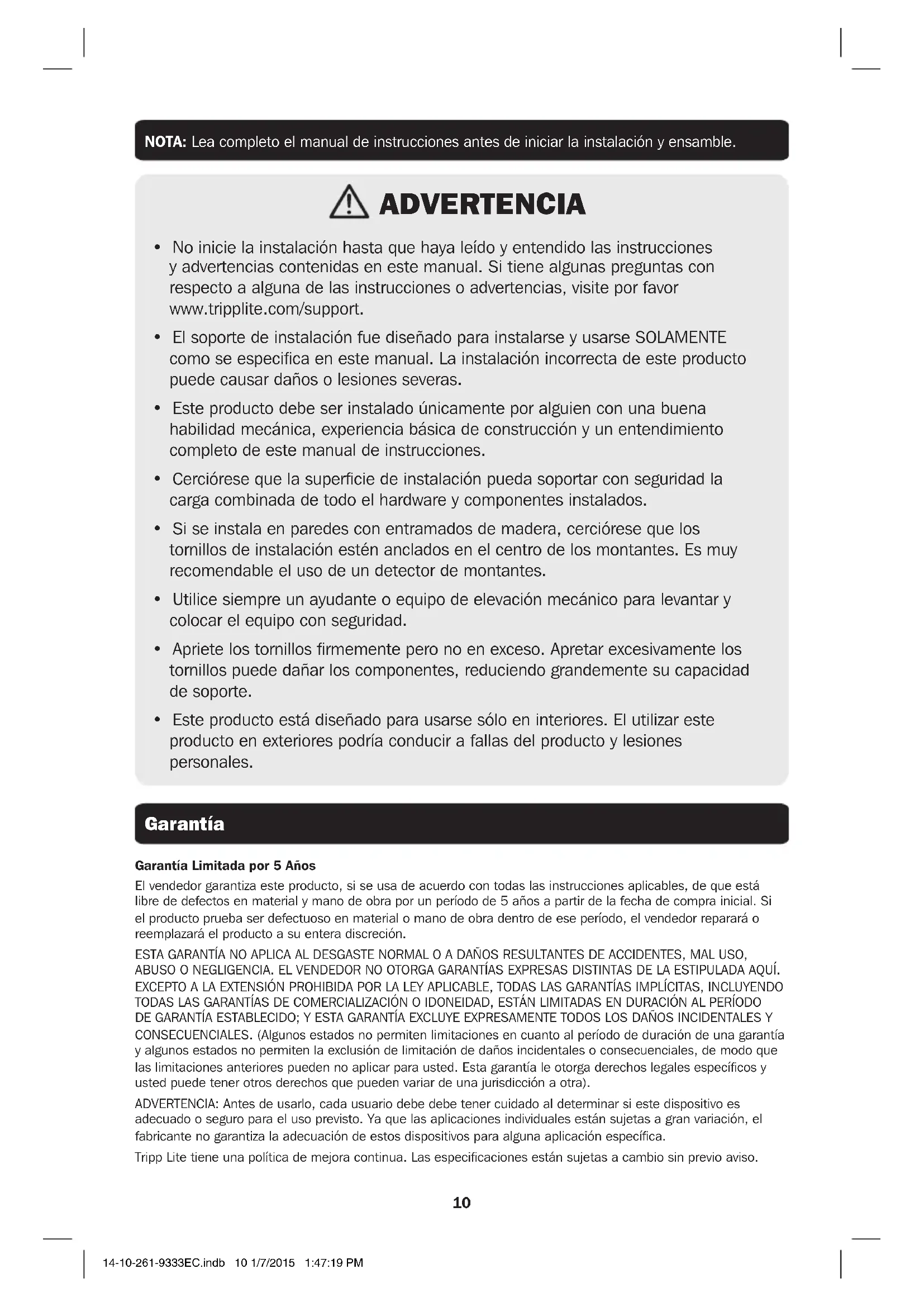 - Este producto está diseñado para usarse sólo en interiores. El utilizar este producto en exteriores podría conducir a fallas del producto y lesiones personales. Garantía Limitada por 5 Años El vendedor garantiza este producto, si se usa de acuerdo con todas las instrucciones aplicables, de que está libre de defectos en material y mano de obra por un período de 5 años a partir de la fecha de compra inicial. Si el producto prueba ser defectuoso en material o mano de obra dentro de ese período, el vendedor reparará o reemplazará el producto a su entera discreción. ESTA GARANTÍA NO APLICA AL DESGASTE NORMAL O A DAÑOS RESULTANTES DE ACCIDENTES, MAL USO, ABUSO O NEGLIGENCIA. EL VENDEDOR NO OTORGA GARANTÍAS EXPRESAS DISTINTAS DE LA ESTIPULADA AQUÍ. EXCEPTO A LA EXTENSIÓN PROHIBIDA POR LA LEY APLICABLE, TODAS LAS GARANTÍAS IMPLÍCITAS, INCLUYENDO TODAS LAS GARANTÍAS DE COMERCIALIZACIÓN O IDONEIDAD, ESTÁN LIMITADAS EN DURACIÓN AL PERÍODO DE GARANTÍA ESTABLECIDO; Y ESTA GARANTÍA EXCLUYE EXPRESAMENTE TODOS LOS DAÑOS INCIDENTALES Y CONSECUENCIALES. (Algunos estados no permiten limitaciones en cuanto al período de duración de una garantía y algunos estados no permiten la exclusión de limitación de daños incidentales o consecuenciales, de modo que las limitaciones anteriores pueden no aplicar para usted. Esta garantía le otorga derechos legales específicos y usted puede tener otros derechos que pueden variar de una jurisdicción a otra). ADVERTENCIA: Antes de usarlo, cada usuario debe debe tener cuidado al determinar si este dispositivo es adecuado o seguro para el uso previsto. Ya que las aplicaciones individuales están sujetas a gran variación, el fabricante no garantiza la adecuación de estos dispositivos para alguna aplicación específica. Tripp Lite tiene una política de mejora continua. Las especificaciones están sujetas a cambio sin previo aviso. 14-10-261-9333EC.indb 10 1/7/2015 1:47:19 PM11 Accesorios y Partes Incluidas en el Empaque IMPORTANTE: Asegúrese antes de instalar, de haber recibido todas las partes de acuerdo a la lista de comprobación de componentes. Si faltase cualquier parte o estuviese dañada, visite www.tripplite.com/support para solicitar servicio. Soporte de Pared (x1) Plantilla (x1) Soporte de Adaptador (x2) M5X14 (x4) M8X30 (x4) Tornillo de Anclaje (x6) Anclaje para Concreto (x6) Arandela D6 (x6) M6X14 (x4) Arandela (x4) M8X20 (x4) Espaciador Pequeño (x8) M6X30 (x4) Espaciador Grande (x4) Paquete M Paquete W 14-10-261-9333EC.indb 11 1/7/2015 1:47:19 PM12