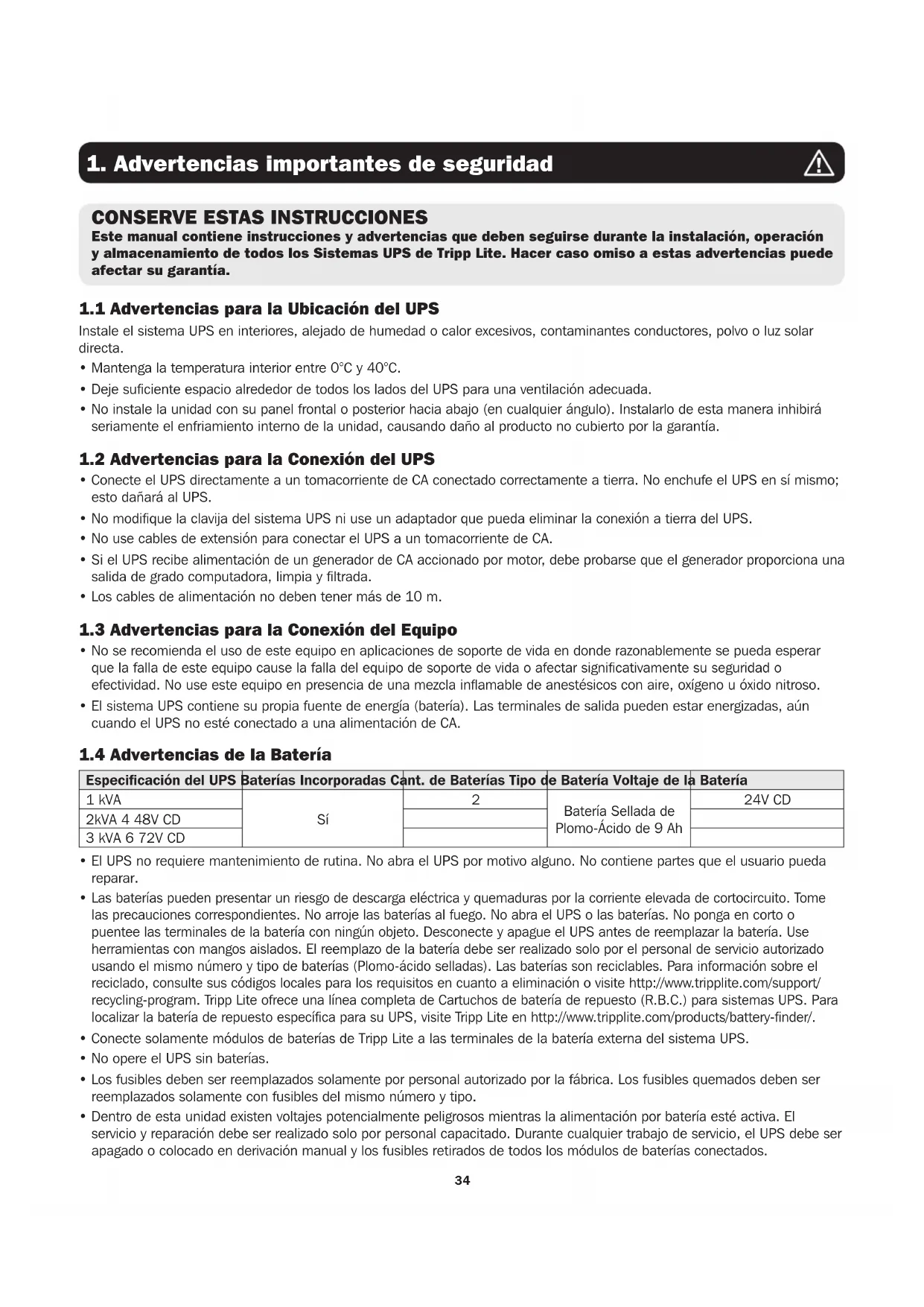 Este manual contiene instrucciones y advertencias que deben seguirse durante la instalación, operación y almacenamiento de todos los Sistemas UPS de Tripp Lite. Hacer caso omiso a estas advertencias puede afectar su garantía.