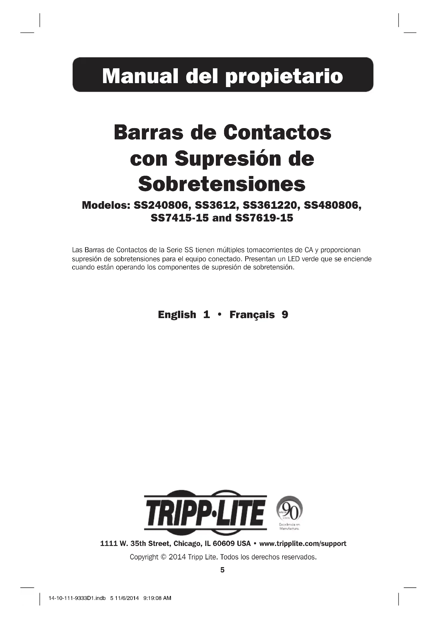 Entrada Longitud de Cable Longitud Total Breaker SS240806 15A 8 x 5-15R 1050 joules 5-15P 1.83 m 61 cm 15A SS3612 15A 12 x 5-15R 1050 joules 5-15P 4.57 m 91.4 cm 15A SS361220 20A 2 x 5-20R, 10 x 5-15R 1650 joules 5-20P 4.57 m 91.4 cm 20A SS480806 15A 8 x 5-15R 1650 joules 5-15P 1.83 m 1.22 m 15A SS7415-15 15A 16 x 5-15R 1650 joules 5-15P 4.57 m 1.22 m 15A SS7619-15 15A 24 x 5-15R 1650 joules 5-15P 4.57 m 1.83 m 15A 14-10-111-9333D1.indb 7 11/6/2014 9:19:08 AM8 1111 W. 35th Street, Chicago, IL 60609 USA • www.tripplite.com/support Garantia Limitada de por Vida El vendedor garantiza que este producto, si es usado de acuerdo a todas las instrucciones en este manual, estará libre de defectos originales de fabricación en materiales y mano de obra de por vida. Si el producto presentara defectos en partes o mano de obra durante el período antes mencionado, el vendedor reparará o reemplazará el producto a sóla discreción. El servicio de garantía puede obtenerse sólamente si el usuario entrega o envia el producto (con el material de empaque original y los cargos de fletes pagados) al Centro de Servicio más cercano o a: TRIPP LITE, 1111 W. 35th Street; Chicago, IL 60609 USA. El vendedor pagará los cargos de despacho del retorno. Visite www.tripplite.com/support antes de enviar algún equipo para reparación. ESTA GARANTIA NO ES VALIDA EN CASOS DE DESGASTE NORMAL O DAÑOS CAUSADOS POR ACCIDENTES, USO INCORRECTO, ABUSO O NEGLIGENCIA. EL VENDEDOR NO PROVEE NINGUNA OTRA GARANTIA EXCEPTO POR LA GARANTIA EXPRESA EN ESTE DOCUMENTO. EXCEPTO DONDE SEA PROHIBIDO POR LA LEY, TODAS LAS GARANTIAS IMPLICITAS, INCLUYENDO GARANTIAS DE COMERCIALIZACION O PROPIEDAD, SON LIMITADAS EN SU DURACION AL PERIODO DE GARANTIA AQUI MENCIONADO; ESTA GARANTIA EXPRESAMENTE EXCLUYE TODOS LOS DAÑOS INCIDENTALES O CONSIGUIENTES. (Algunos estados no permiten un período de tiempo limitado en garantias implícitas, y otros estados no permiten la exclusión o limitación de daños incidentales o consiguientes, por lo que las limitaciones antes mencionadas pueden variar de acuerdo a su lugar de residencia. Esta garantía le concede a usted derechos específicos. Ustede puede tener otros derechos de acuerdo al código legal local.) ADVERTENCIA: Es la responsabilidad del usuario individual el determinar, previamente al uso de esta unidad, si el dispositivo es apropiado, adecuado o seguro para el uso deseado. Las aplicaciones individuales están sujetas a grandes variaciones, por lo que el fabricante no hace ninguna representación o concede ninguna garantía relacionada con el uso de estas unidades para ninguna aplicación específica. La política de Tripp Lite es una de mejoramiento constante. Estas especificaciones están sujetas a cambios sin previo aviso. Cumplimiento de las normas de los números de identificación Para fines de identificación y certificación del cumplimiento de las normas, su producto Tripp Lite tiene asignado un número de serie único. Puede encontrar el número de serie en la etiqueta de la placa de identificación del producto, junto con los símbolos de aprobación e información requeridos. Al solicitar información sobre el cumplimiento de las normas para este producto, siempre mencione el número de serie. El número de serie no debe ser confundido con el nombre de identificación ni con el número de modelo del producto. Tripp Lite tiene una política de mejoramiento continuo. Las especificaciones están sujetas a cambio sin previo aviso. 14-10-111-9333D1.indb 8 11/6/2014 9:19:08 AM9 Barres d’alimentation avec suppression de la surtension Modèles : SS240806, SS3612, SS361220, SS480806, SS7415-15 and SS7619-15 1111 W. 35th Street, Chicago, IL 60609 USA • www.tripplite.com/support Copyright © 2014 Tripp Lite. Tous droits réservés. Manual du propriétaire Les barres d’alimentation de série SS comportent plusieurs sorties CA et fournissent une suppression de la surtension à l’équipement connecté. Elles possèdent un voyant à DEL vert qui s’allume lorsque les composant de suppression de la surtension fonctionnent. English 1 • Español 5 14-10-111-9333D1.indb 9 11/6/2014 9:19:12 AM10 Consignes de Sécurité Importantes Raccord de Matériel