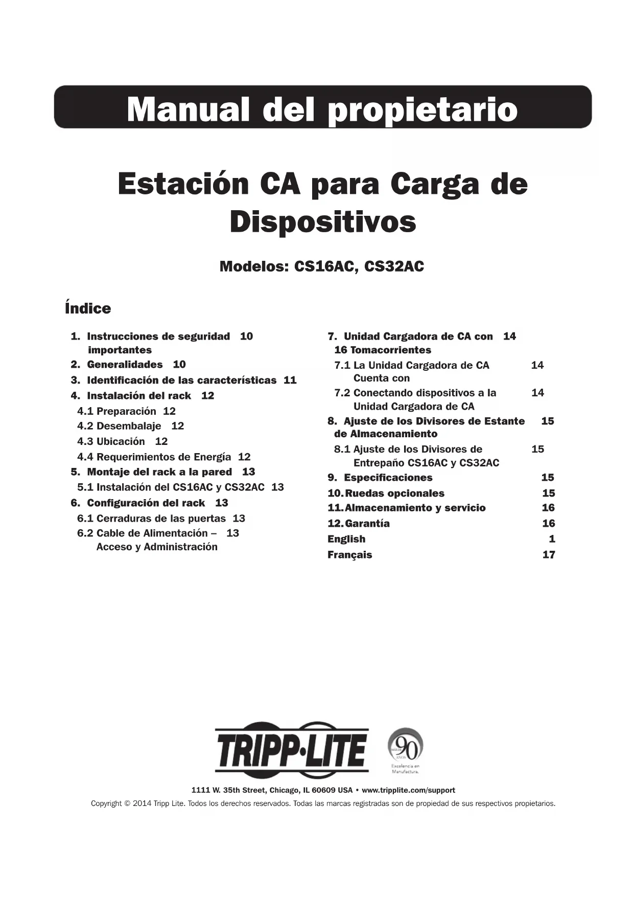 English 1 Français 17 Estación CA para Carga de Dispositivos Modelos: CS16AC, CS32AC Manual del propietario 1111 W. 35th Street, Chicago, IL 60609 USA • www.tripplite.com/support Copyright © 2014 Tripp Lite. Todos los derechos reservados. Todas las marcas registradas son de propiedad de sus respectivos propietarios.10
