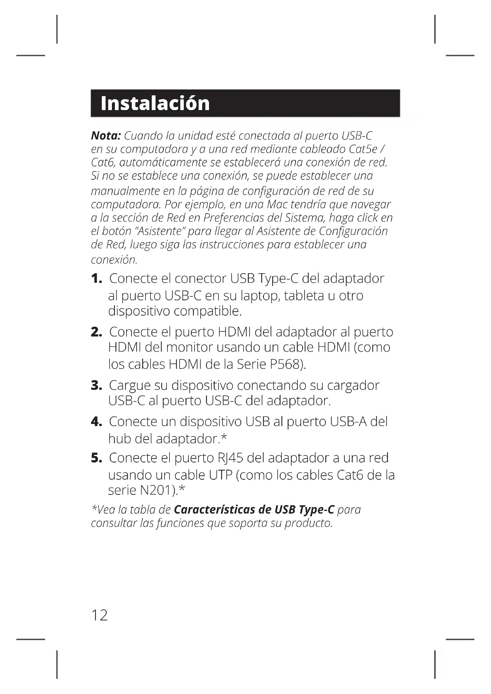 usando un cable UTP (como los cables Cat6 de la serie N201).* *Vea la tabla de Características de USB Type-C para consultar las funciones que soporta su producto.13 Modelos U444-06N-HU-C