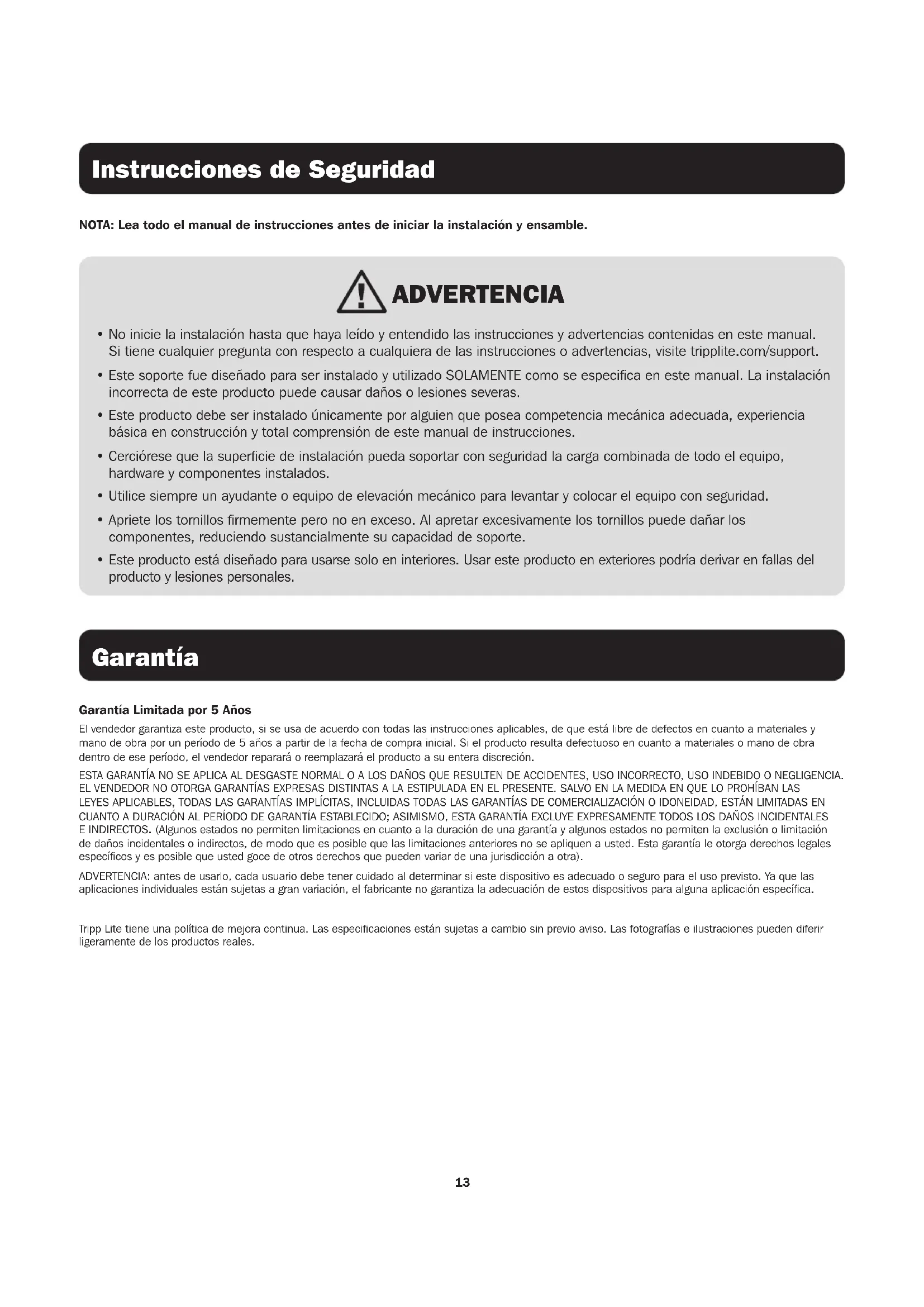 - Este producto está diseñado para usarse solo en interiores. Usar este producto en exteriores podría derivar en fallas del producto y lesiones personales. Garantía Limitada por 5 Años El vendedor garantiza este producto, si se usa de acuerdo con todas las instrucciones aplicables, de que está libre de defectos en cuanto a materiales y mano de obra por un período de 5 años a partir de la fecha de compra inicial. Si el producto resulta defectuoso en cuanto a materiales o mano de obra dentro de ese período, el vendedor reparará o reemplazará el producto a su entera discreción. ESTA GARANTÍA NO SE APLICA AL DESGASTE NORMAL O A LOS DAÑOS QUE RESULTEN DE ACCIDENTES, USO INCORRECTO, USO INDEBIDO O NEGLIGENCIA. EL VENDEDOR NO OTORGA GARANTÍAS EXPRESAS DISTINTAS A LA ESTIPULADA EN EL PRESENTE. SALVO EN LA MEDIDA EN QUE LO PROHÍBAN LAS LEYES APLICABLES, TODAS LAS GARANTÍAS IMPLÍCITAS, INCLUIDAS TODAS LAS GARANTÍAS DE COMERCIALIZACIÓN O IDONEIDAD, ESTÁN LIMITADAS EN CUANTO A DURACIÓN AL PERÍODO DE GARANTÍA ESTABLECIDO; ASIMISMO, ESTA GARANTÍA EXCLUYE EXPRESAMENTE TODOS LOS DAÑOS INCIDENTALES E INDIRECTOS. (Algunos estados no permiten limitaciones en cuanto a la duración de una garantía y algunos estados no permiten la exclusión o limitación de daños incidentales o indirectos, de modo que es posible que las limitaciones anteriores no se apliquen a usted. Esta garantía le otorga derechos legales específicos y es posible que usted goce de otros derechos que pueden variar de una jurisdicción a otra). ADVERTENCIA: antes de usarlo, cada usuario debe tener cuidado al determinar si este dispositivo es adecuado o seguro para el uso previsto. Ya que las aplicaciones individuales están sujetas a gran variación, el fabricante no garantiza la adecuación de estos dispositivos para alguna aplicación específica. Tripp Lite tiene una política de mejora continua. Las especificaciones están sujetas a cambio sin previo aviso. Las fotografías e ilustraciones pueden diferir ligeramente de los productos reales. NOTA: Lea todo el manual de instrucciones antes de iniciar la instalación y ensamble.14 Lista de Comprobación de Componentes IMPORTANTE: Antes de proceder a instalar, asegúrese de haber recibido todas las partes de acuerdo con la lista de comprobación de componentes. Si faltase alguna parte o estuviese dañada, visite tripplite.com/support para solicitar servicio.