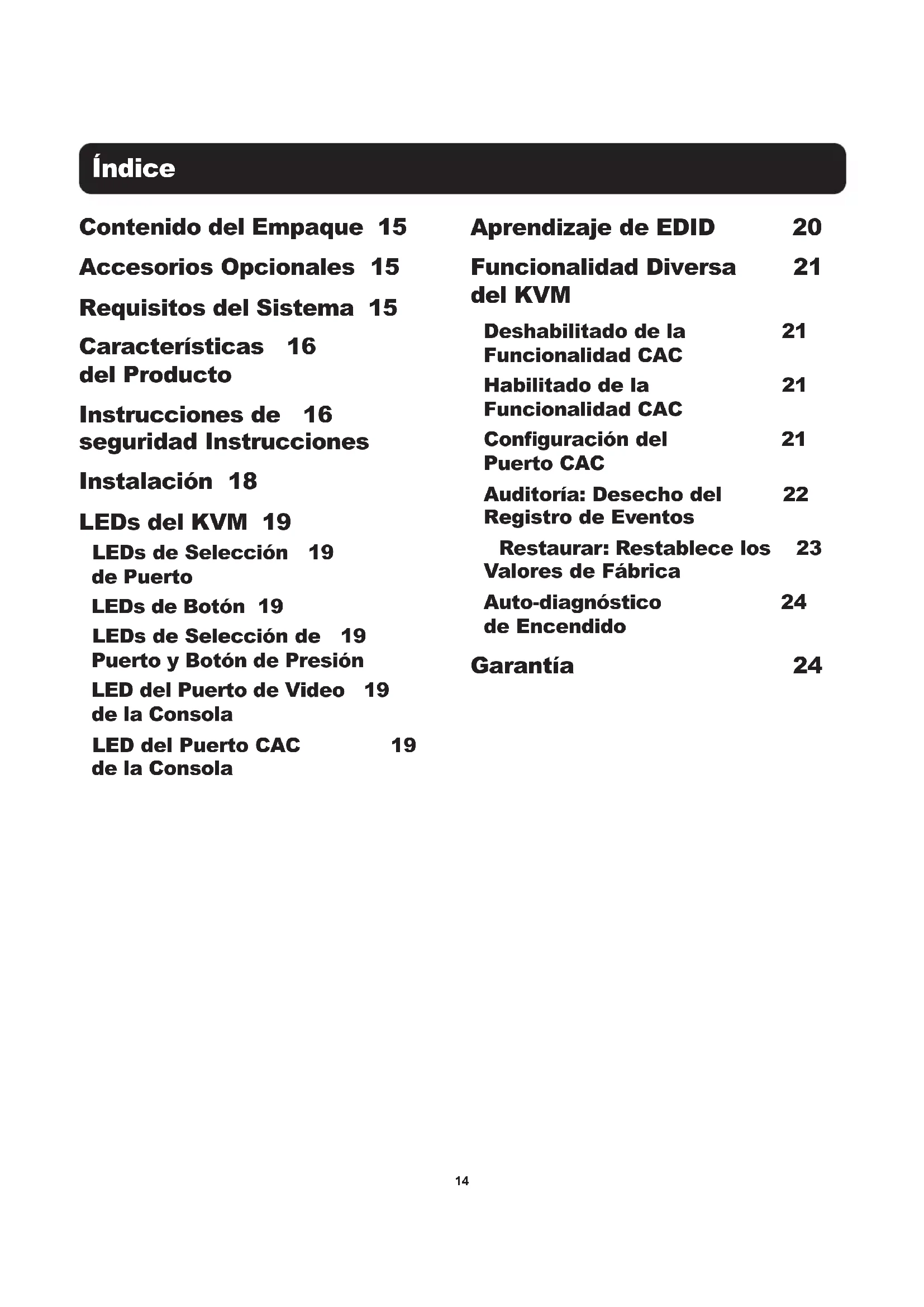 - ¡Advertencia! Si se reemplaza la batería con un tipo incorrecto de batería, existe un riesgo de explosión. No intente dar servicio al dispositivo usted mismo. Solicite todo servicio al personal de servicio calicado.18 Instalación Nota: Antes de proceder con al instalación, cerciórese que estén apagados todos los dispositivos que se estén conectando al KVM.