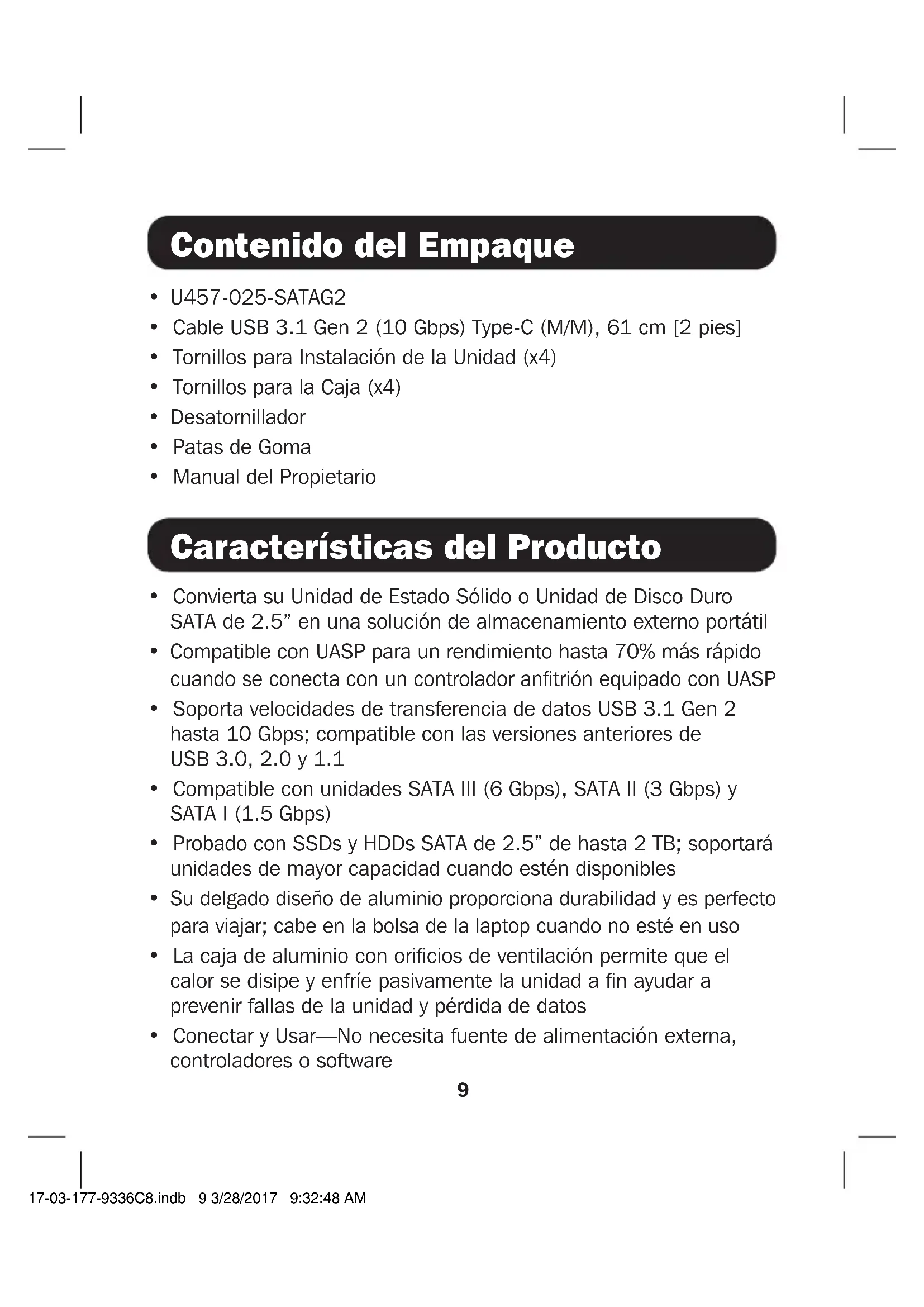 encenderá permanentemente para indicar que hay alimentación presente y destellará durante la lectura / escritura de datos. Especificaciones: Conexión de la Unidad Datos + Energía SATA de 22 Pines Conexión USB USB Type-C LED Blanco: Energía y Acceso de Datos Tasa Máxima de Transferencia de Datos 10 Gbps Capacidad Máxima de la Unidad Probado hasta 2 TB Temperatura de Operación 10 °C a 50 °C [50 °F a 122 °F] Humedad de Operación 10% a 80% de HR USB Type-C y USB-C son marcas comerciales registradas del USB Implementers Forum 17-03-177-9336C8.indb 12 3/28/2017 9:32:49 AM13 Garantía Garantía limitada por 1 año TRIPP LITE garantiza por un (1) año desde la fecha de compra inicial que este producto no tiene defectos de materiales ni de mano de obra. La obligación TRIPP LITE bajo esta garantía está limitada a la reparación o reemplazo (A su entera discreción) de cualquier producto defectuoso. Para obtener servicio bajo esta garantía, debe obtener un número de Autorización de Devolución de Mercancía (RMA) de TRIPP LITE o de un centro de servicio autorizado de TRIPP LITE. Los productos deben ser regresados a TRIPP LITE o a un centro de servicio autorizado de TRIPP LITE con los cargos de transporte prepagados y deben acompañarse con una breve descripción del problema y un comprobante de la fecha y el lugar de compra. Esta garantía no se aplica a equipos que hayan sido dañados por accidente, negligencia o mal uso, o hayan sido alterados o modificados de alguna manera. EXCEPTO COMO SE INDICA EN EL PRESENTE, TRIPP LITE NO HACE GARANTÍAS EXPRESAS O IMPLÍCITAS, INCLUIDAS GARANTÍAS DE COMERCIABILIDAD Y ADECUACIÓN PARA UN PROPÓSITO PARTICULAR. Algunos estados no permiten la limitación o exclusión de garantías implícitas; por lo tanto, las limitaciones o exclusiones antes mencionadas pueden no aplicarse al comprador. EXCEPTO COMO SE INDICA ANTERIORMENTE, EN NINGÚN CASO TRIPP LITE SERÁ RESPONSABLE POR DAÑOS DIRECTOS, INDIRECTOS, ESPECIALES, INCIDENTALES O CONSECUENTES QUE SURJAN DEL USO DE ESTE PRODUCTO, INCLUSO SI SE ADVIERTE SOBRE LA POSIBILIDAD DE TAL DAÑO. Específicamente, TRIPP LITE no es responsable por ningún costo, como pérdida de utilidades o ingresos, pérdida de equipos, pérdida del uso de equipos, pérdida de software, pérdida de datos, costos de sustituciones, reclamaciones de terceros o de cualquier otra forma. 17-03-177-9336C8.indb 13 3/28/2017 9:32:49 AM14 Garantía Información de Cumplimiento con WEEE por los Clientes y Recicladores de Tripp Lite (Unión Europea) Bajo la Directiva de Desechos de Equipos Eléctricos y Electrónicos (WEEE) [Waste Electrical and Electronic Equipment] y regulaciones aplicables, cuando los clientes adquieren un nuevo equipo eléctrico y electrónico de Tripp Lite están obligados a: