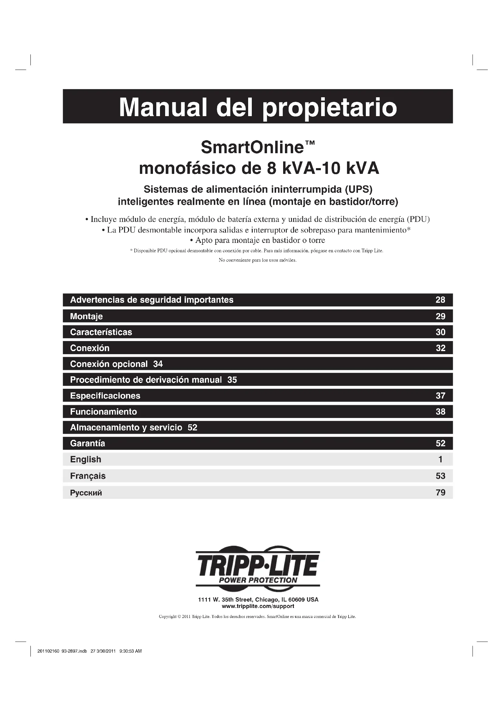 - Disponible PDU opcional desmontable con conexión por cable. Para más información, póngase en contacto con Tripp Lite.No conveniente para los usos móviles. Advertencias de seguridad importantes 28 Montaje 29 Conexión 32 Características 30 Funcionamiento 38 Almacenamiento y servicio 52 Garantía 52 Conexión opcional 34 Procedimiento de derivación manual 35 Especificaciones 37 English 1 Français 53 Ðóññêèé 79 201102160 93-2897.indb 27 3/30/2011 9:30:53 AM28 Advertencias de seguridad importantes CONSERVE ESTAS INSTRUCCIONES. Este manual contiene instrucciones y advertencias importantes que deben seguirse durante la instalación y el mantenimiento de todos los sistemas UPS SmartOnline de Tripp Lite de montaje en torre o en bastidor, y de sus baterías. La falta de observar estas advertencias podría afectar su garantía. Advertencias sobre la ubicación del UPS