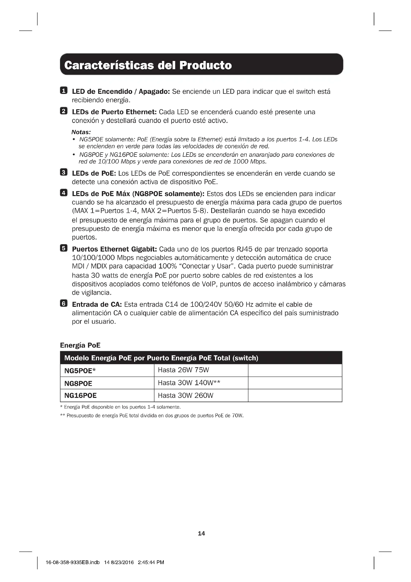 Entrada de CA: Esta entrada C14 de 100/240V 50/60 Hz admite el cable de alimentación CA o cualquier cable de alimentación CA específico del país suministrado por el usuario. Energía PoE Modelo Energía PoE por Puerto Energía PoE Total (switch) NG5POE* Hasta 26W 75W NG8POE Hasta 30W 140W** NG16POE Hasta 30W 260W