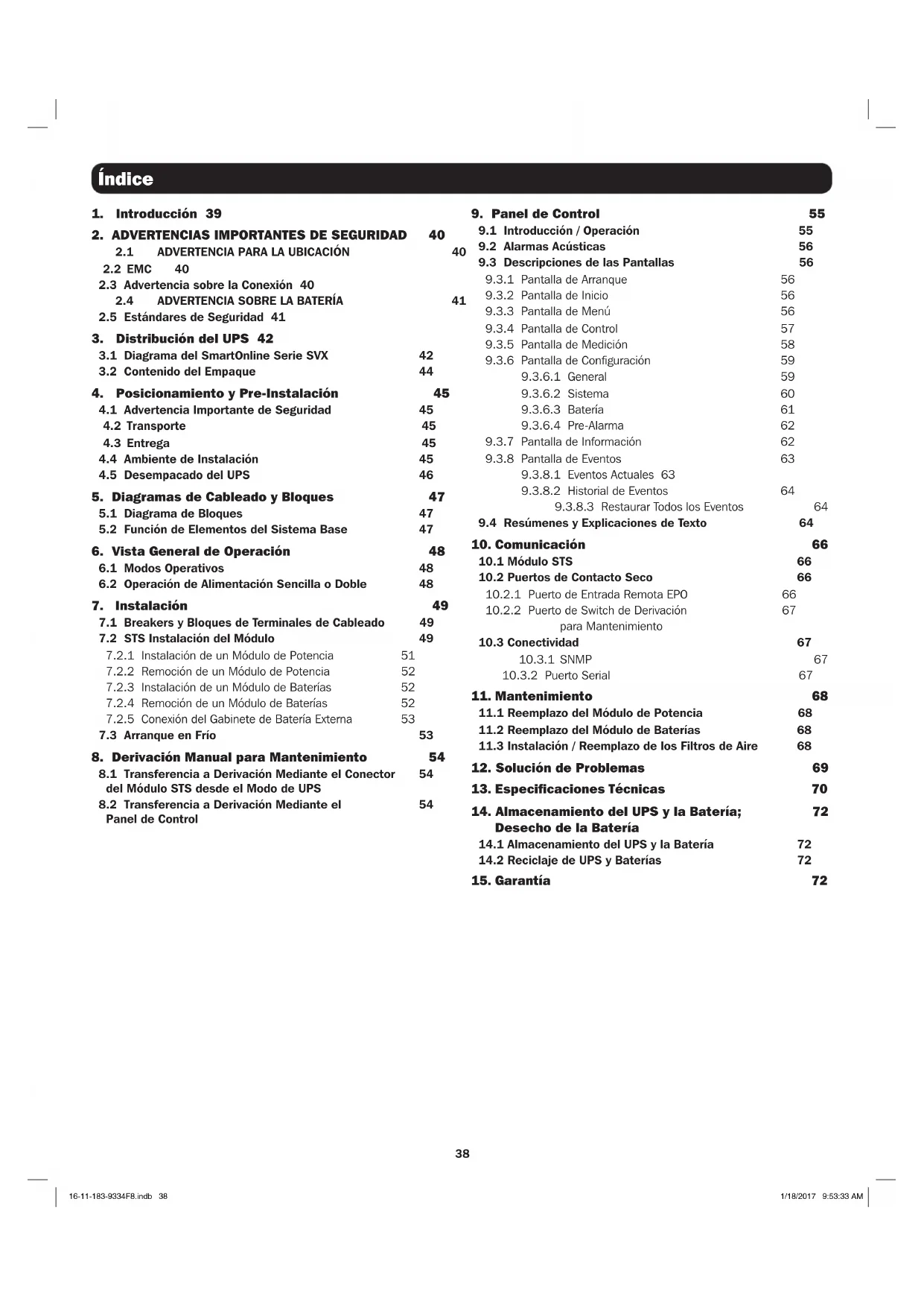 Load S Out (kVA) P Out (kW) Load Level (%) Voltaje de fase de entrada (L1, L2, L3), Unidad 0.1V Frecuencia de entrada (L1, L2, L3), Unidad 0.1Hz Voltaje de fase de salida (L1, L2, L3), Unidades 0.1V Corriente de fase de salida (L1, L2, L3), Unidades 0.1A Frecuencia de salida (L1, L2, L3), Unidades 0.1Hz Factor de potencia de salida (L1, L2, L3), Unidades 0.00 Voltaje de fase de derivación (L1, L2, L3), Unidad 0.1V Frecuencia de derivación (L1, L2, L3), Unidades 0.1Hz Factor de potencia de la derivación (L1, L2, L3), Unidades (NA) Potencia aparente, Unidades 0.1kVA Potencia real, Unidades 0.1kW Porcentaje de la carga especificada del UPS, Unidades 1% 16-11-183-9334F8.indb 58 1/18/2017 9:54:02 AM59 Batería Battery Positive Voltage (V) Negative Voltage (V) Positive Current (A) Negative Current (A) Remain Time (Min) Capacity (%) Test Result Charging Status