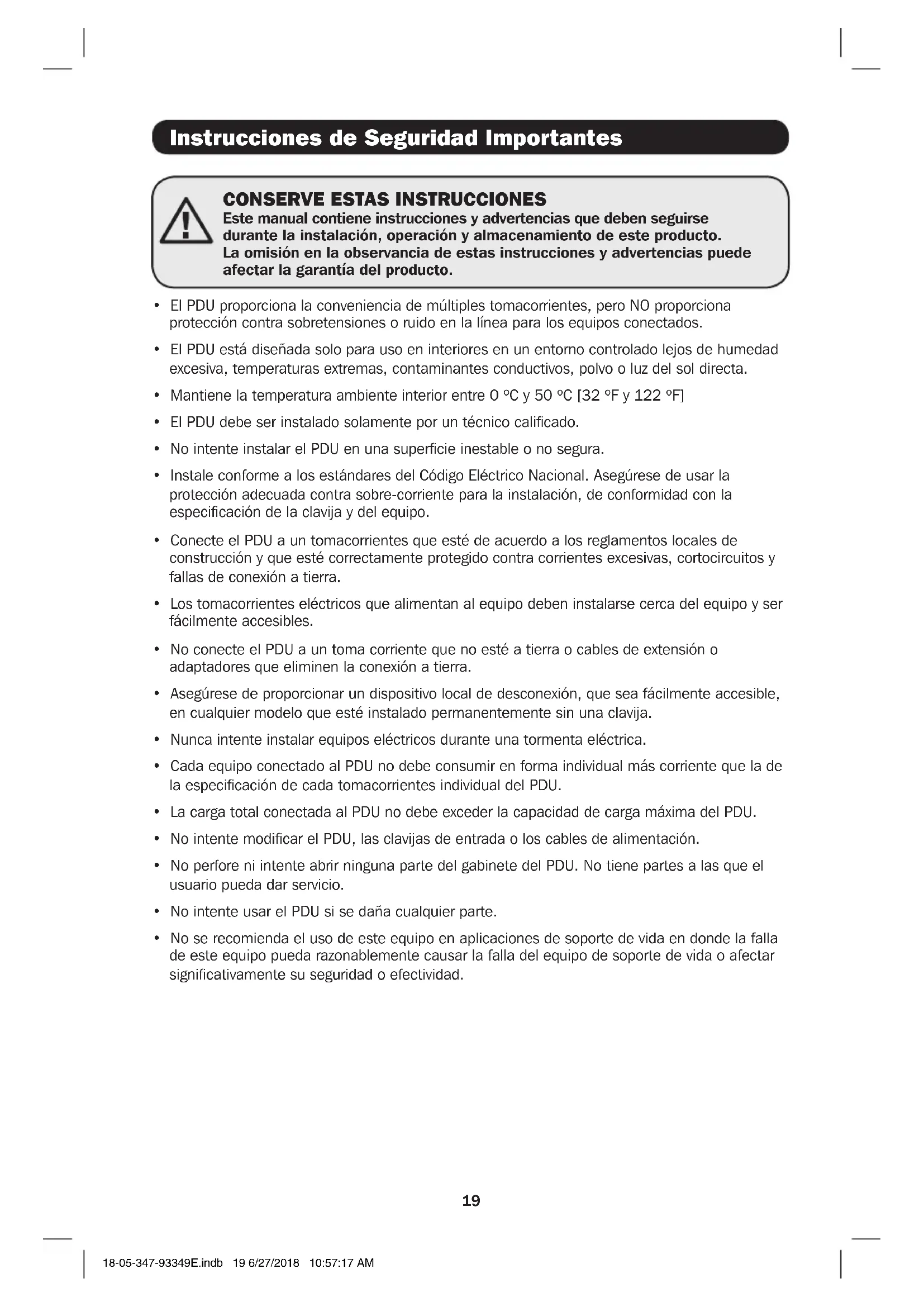 - El PDU proporciona la conveniencia de múltiples tomacorrientes, pero NO proporciona protección contra sobretensiones o ruido en la línea para los equipos conectados.