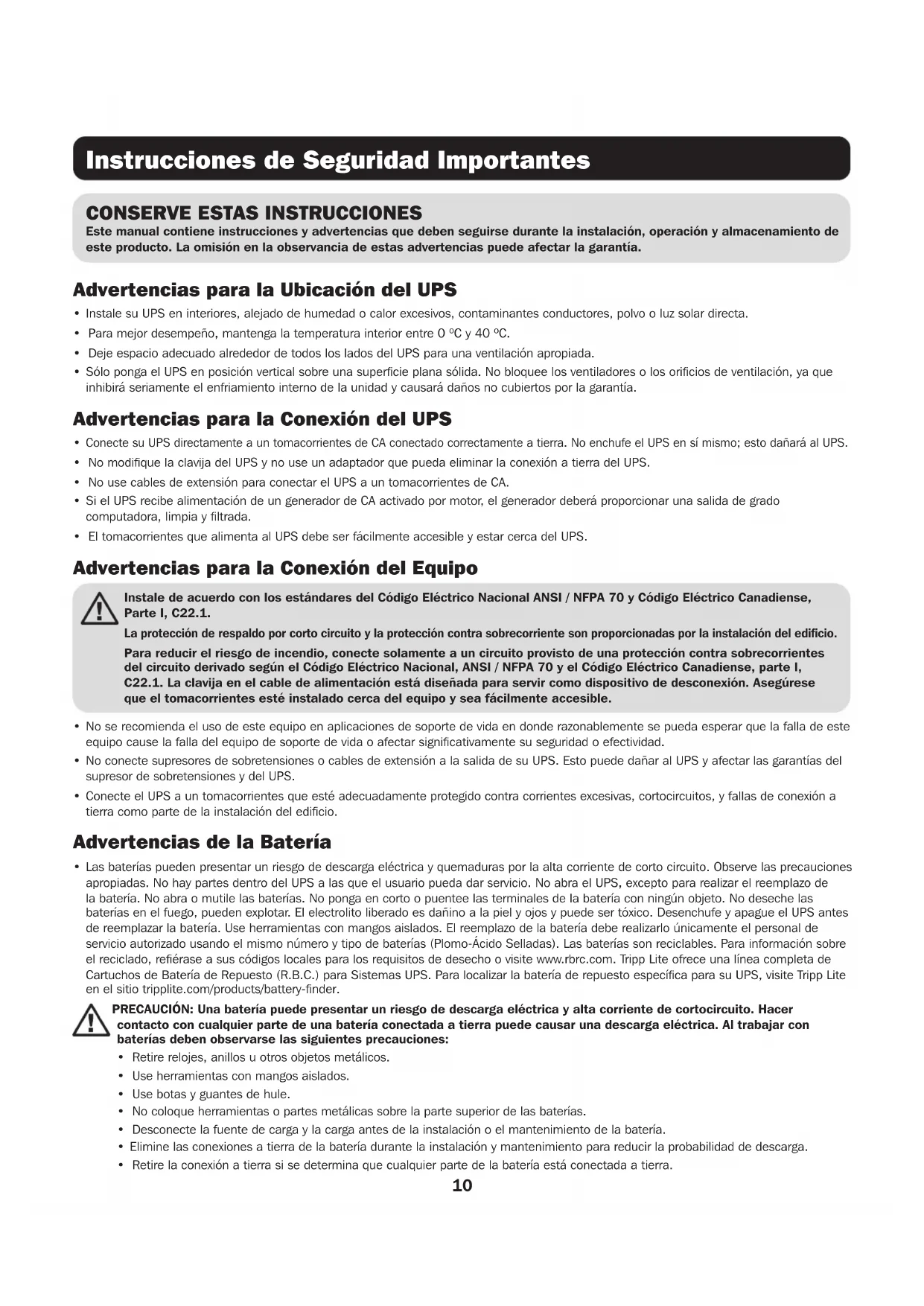 - El tomacorrientes que alimenta al UPS debe ser fácilmente accesible y estar cerca del UPS. Advertencias para la Conexión del Equipo Instale de acuerdo con los estándares del Código Eléctrico Nacional ANSI / NFPA 70 y Código Eléctrico Canadiense, Parte I, C22.1. La protección de respaldo por corto circuito y la protección contra sobrecorriente son proporcionadas por la instalación del edificio. Para reducir el riesgo de incendio, conecte solamente a un circuito provisto de una protección contra sobrecorrientes del circuito derivado según el Código Eléctrico Nacional, ANSI / NFPA 70 y el Código Eléctrico Canadiense, parte I, C22.1. La clavija en el cable de alimentación está diseñada para servir como dispositivo de desconexión. Asegúrese que el tomacorrientes esté instalado cerca del equipo y sea fácilmente accesible.