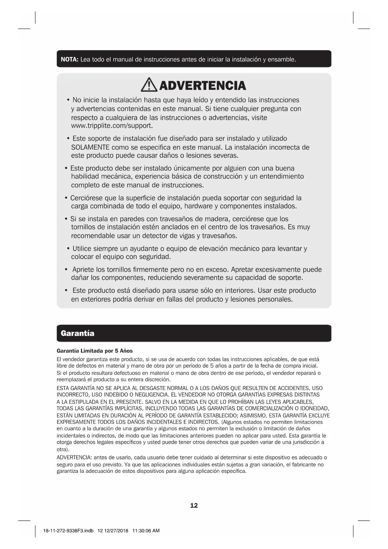 - Este producto está diseñado para usarse sólo en interiores. Usar este producto en exteriores podría derivar en fallas del producto y lesiones personales. Garantía Limitada por 5 Años El vendedor garantiza este producto, si se usa de acuerdo con todas las instrucciones aplicables, de que está libre de defectos en material y mano de obra por un período de 5 años a partir de la fecha de compra inicial. Si el producto resultara defectuoso en material o mano de obra dentro de ese período, el vendedor reparará o reemplazará el producto a su entera discreción. ESTA GARANTÍA NO SE APLICA AL DESGASTE NORMAL O A LOS DAÑOS QUE RESULTEN DE ACCIDENTES, USO INCORRECTO, USO INDEBIDO O NEGLIGENCIA. EL VENDEDOR NO OTORGA GARANTÍAS EXPRESAS DISTINTAS A LA ESTIPULADA EN EL PRESENTE. SALVO EN LA MEDIDA EN QUE LO PROHÍBAN LAS LEYES APLICABLES, TODAS LAS GARANTÍAS IMPLÍCITAS, INCLUYENDO TODAS LAS GARANTÍAS DE COMERCIALIZACIÓN O IDONEIDAD, ESTÁN LIMITADAS EN DURACIÓN AL PERÍODO DE GARANTÍA ESTABLECIDO; ASIMISMO, ESTA GARANTÍA EXCLUYE EXPRESAMENTE TODOS LOS DAÑOS INCIDENTALES E INDIRECTOS. (Algunos estados no permiten limitaciones en cuanto a la duración de una garantía y algunos estados no permiten la exclusión o limitación de daños incidentales o indirectos, de modo que las limitaciones anteriores pueden no aplicar para usted. Esta garantía le otorga derechos legales específicos y usted puede tener otros derechos que pueden variar de una jurisdicción a otra). ADVERTENCIA: antes de usarlo, cada usuario debe tener cuidado al determinar si este dispositivo es adecuado o seguro para el uso previsto. Ya que las aplicaciones individuales están sujetas a gran variación, el fabricante no garantiza la adecuación de estos dispositivos para alguna aplicación específica. 18-11-272-9338F3.indb 12 12/27/2018 11:30:06 AM13 Accesorios y Partes Incluidas en el Empaque IMPORTANTE: Antes de instalar, cerciórese de haber recibido todas las partes de acuerdo a la lista de comprobación de componentes. Si faltara cualquier parte o estuviese dañada, visite www.tripplite.com/support para solicitar servicio. Placa de Pared (x1) Tornillo M5 x 14 (x4) Barra de Seguridad (x1) Tornillo M6 x 6 (x8) Pasador de seguridad (x1) Llave hexagonal de 5 mm (x1) Arandela D8 (x2) Candado de Combinación (x1) Soporte Adaptador (x2) Tornillo M6 x 14 (x4) Tornillo de Anclaje (x6) Arandela (x4) Taquete (x6) Espaciador Pequeño (x8) Tornillo M6 x 30 (x4) Arandela D6 (x6) Espaciador Grande (x8) Tornillo M8 x 30 (x4) Tornillo M8 x 50 (x4) Soporte de Extensión (x2) Paquete M Paquete W 18-11-272-9338F3.indb 13 12/27/2018 11:30:06 AM14 Instalación