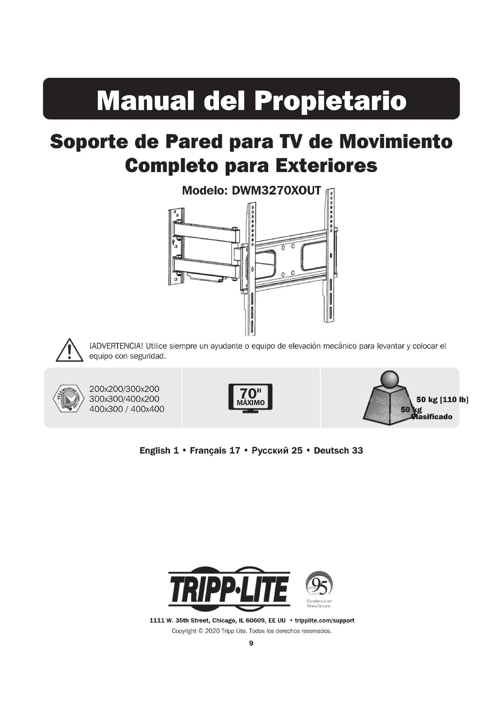 1111 W. 35th Street, Chicago, IL 60609, EE UU • tripplite.com/support 20-06-295 93-3CC4_RevA Garantía Garantía Limitada por 5 Años El vendedor garantiza este producto, si se usa de acuerdo con todas las instrucciones aplicables, de que está libre de defectos en cuanto a materiales y mano de obra por un período de 5 años a partir de la fecha de compra inicial. Si el producto resulta defectuoso en cuanto a materiales o mano de obra dentro de ese período, el vendedor reparará o reemplazará el producto a su entera discreción. ESTA GARANTÍA NO SE APLICA AL DESGASTE NORMAL O A LOS DAÑOS QUE RESULTEN DE ACCIDENTES, USO INCORRECTO, USO INDEBIDO O NEGLIGENCIA. EL VENDEDOR NO OTORGA GARANTÍAS EXPRESAS DISTINTAS A LA ESTIPULADA EN EL PRESENTE. SALVO EN LA MEDIDA EN QUE LO PROHÍBAN LAS LEYES APLICABLES, TODAS LAS GARANTÍAS IMPLÍCITAS, INCLUIDAS TODAS LAS GARANTÍAS DE COMERCIALIZACIÓN O IDONEIDAD, ESTÁN LIMITADAS EN CUANTO A DURACIÓN AL PERÍODO DE GARANTÍA ESTABLECIDO; ASIMISMO, ESTA GARANTÍA EXCLUYE EXPRESAMENTE TODOS LOS DAÑOS INCIDENTALES E INDIRECTOS. (Algunos estados no permiten limitaciones en cuanto a la duración de una garantía y algunos estados no permiten la exclusión o limitación de daños incidentales o indirectos, de modo que es posible que las limitaciones anteriores no se apliquen a usted. Esta garantía le otorga derechos legales específicos y es posible que usted goce de otros derechos que pueden variar de una jurisdicción a otra). ADVERTENCIA: antes de usarlo, cada usuario debe tener cuidado al determinar si este dispositivo es adecuado o seguro para el uso previsto. Ya que las aplicaciones individuales están sujetas a gran variación, el fabricante no garantiza la adecuación de estos dispositivos para alguna aplicación específica.17 Manuel de l'utilisateur Support mural extérieur à mouvement complet Modèle : DWM3270XOUT 1111 W. 35th Street, Chicago, IL 60609 USA • tripplite.com/supportDroits d'auteur © 2020 Tripp Lite. Tous droits réservés.AVERTISSEMENT! Toujours faire appel à un assistant ou utiliser de l'équipement de levage mécanique pour soulever et mettre en place l'équipement. 200x200/300x200 300x300/400x200 400x300/400x400 177,8 cm (70 po) MAX. 50 kg50 kg(110 lb)(110 lb)Capacité Capacité nominalenominale English 1 • Español 9 • Русский 25 • Deutsch 3318 Liste des pièces Consignes de sécurité importantes