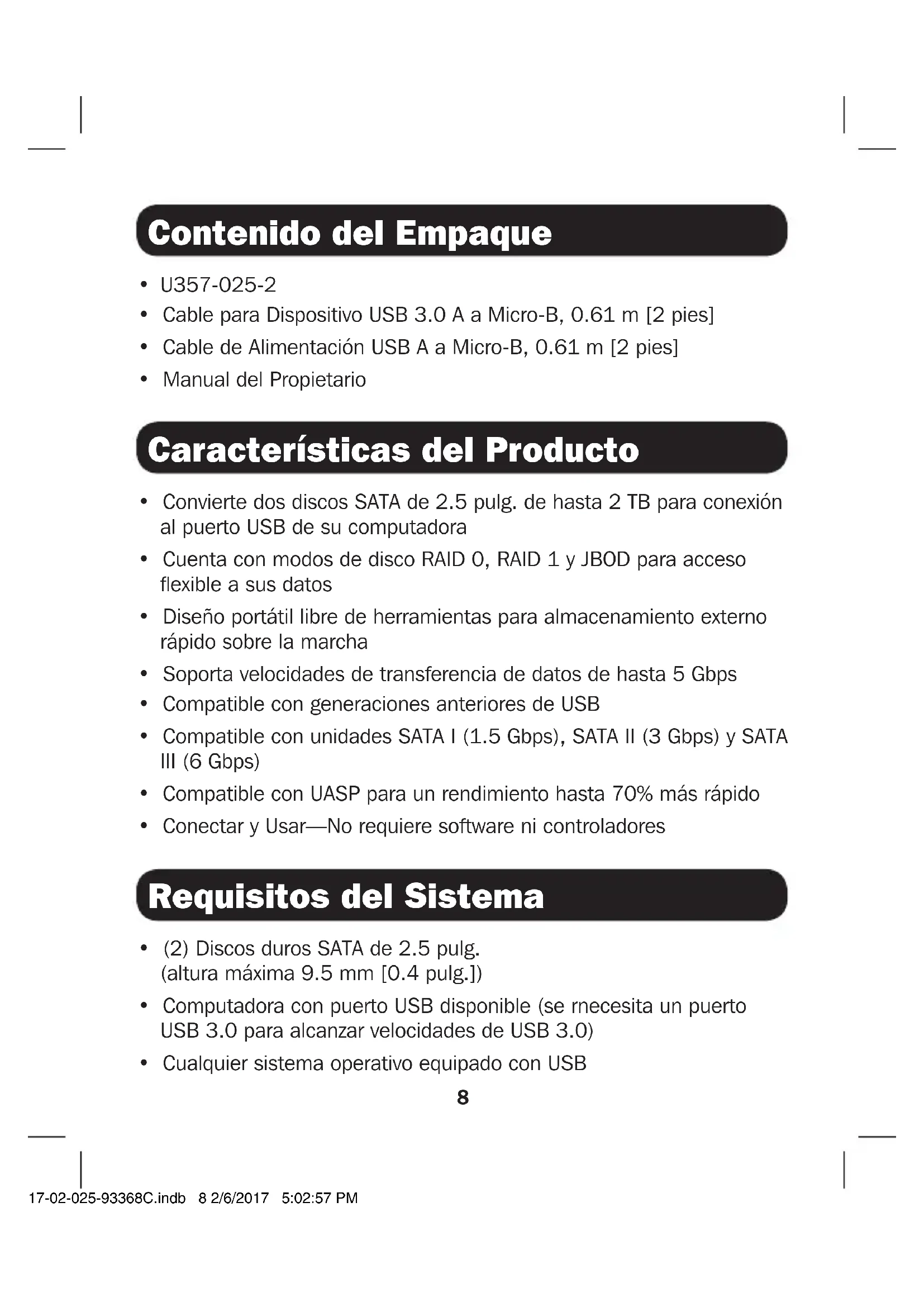 - Regrese el equipo nuevo para reciclado una vez que finalmente sea un desecho Cualquier cambio o modificación en este equipo que no esté aprobado expresamente por Tripp Lite puede invalidar la autoridad del usuario para operarlo. No se recomienda utilizar este equipo en aplicaciones de soporte de vida donde una falla podría llegar a causar la falla del equipo de soporte de vida o afectar significativamente su seguridad o efectividad. Tripp Lite tiene una política de mejora continua. Las especificaciones están sujetas a cambios sin previo aviso. 1111 W. 35th Street, Chicago, IL 60609 EE UU www.tripplite.com/support 17-02-025-93368C.indb 12 2/6/2017 5:02:57 PM13 Manuel de l'utilisateur Boîtier RAID à lecteurs de disque dur portable à baie double de USB 3.0 po à SATA Modèle : U357-025-2 English 1 • Español 7 • Русский 19 1111 W. 35th Street, Chicago, IL 60609 USA www.tripplite.com/support Droits d'auteur © 2017 Tripp Lite. Tous droits réservés. 17-02-025-93368C.indb 13 2/6/2017 5:02:57 PM14 Contenu de l'emballage Configuration requise Caractéristiques du produit