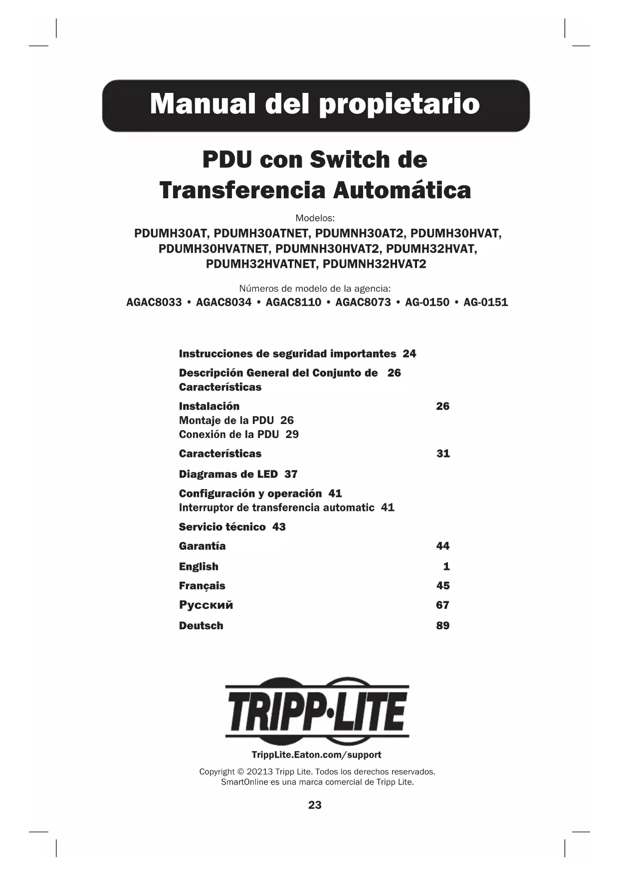 TrippLite.Eaton.com/support Copyright © 20213 Tripp Lite. Todos los derechos reservados. SmartOnline es una marca comercial de Tripp Lite. Instrucciones de seguridad importantes 24 Descripción General del Conjunto de 26 Características Instalación 26 Montaje de la PDU 26 Conexión de la PDU 29 Características 31 Diagramas de LED 37 Configuración y operación 41 Interruptor de transferencia automatic 41 Servicio técnico 43 Garantía 44 English 1 Français 45 Русский 67 Deutsch 8924 Instrucciones de seguridad importantes Este manual contiene información concerniente a la instalación y uso apropiados de las barras de contacto para montaje en bastidor de Tripp Lite. GUARDE ESTAS INSTRUCCIONES. No conecte la regleta de contactos a una toma de corriente que no tenga conexión a tierra. No la use con cables de extensión o adaptadores que eliminen la conexión a tierra. La regleta de contactos está diseñada exclusivamente para uso en interiores. Instálela alejada de dispositivos que emitan calor tales como radiadores y rejillas de calefacción. No la instale donde haya humedad excesiva, ni cualquier otro tipo de contaminante conductivo. Nunca instale un cableado eléctrico durante tormentas eléctricas. Los requerimientos de energía eléctrica de cada dispositivo conectado a una toma de corriente de la regleta de contactos, no deberá exceder el valor nominal de potencia de salida de la regleta de contactos (refiérase a la Ficha técnica). Los requerimientos totales de energía eléctrica de todos los dispositivos conectados a la toma de corriente de la regleta de contactos no deberán exceder el valor nominal de carga máxima de la regleta de contactos (refiérase a la Ficha técnica). PRECAUCION Este aparato no se destina para utilizarse por personas (incluyendo niños), cuyas capacidades fisicas, sensoriales o mentales sean diferentes o estén reducidas, o carezcan de experiencia o conocimiento, a menos que dichas personas reciban una supervisión o capacitación para el funcionamiento del aparato por una persona responsable de su seguridad. Los ninos deben de supervisarse para asegurar que no empleen el aparato como juguete. Nunca utilize el aparato si el cable y la clavija están dañados; si no funciona correctamente o si se ha caido o dañado, llévelo a un centro de servicio autorizado para que lo examinen y lo reparen. Si el cordon de alimentación es dañado, éste debe sustituirse por el fabricante, por su agente de servicio autorizado o por personal calificado con el fin de evitar un peligro.
