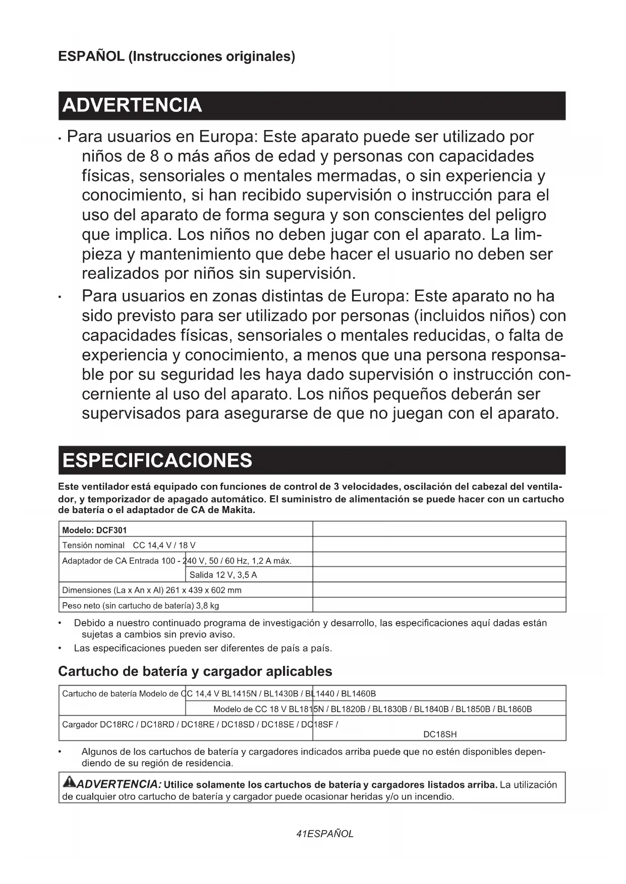 Para usuarios en zonas distintas de Europa: Este aparato no ha sido previsto para ser utilizado por personas (incluidos niños) con capacidades físicas, sensoriales o mentales reducidas, o falta de experiencia y conocimiento, a menos que una persona responsa- bleporsuseguridadleshayadadosupervisiónoinstruccióncon- cerniente al uso del aparato. Los niños pequeños deberán ser supervisadosparaasegurarsedequenojueganconelaparato. ESPECIFICACIONES Este ventilador está equipado con funciones de control de 3 velocidades, oscilación del cabezal del ventila- dor, y temporizador de apagado automático. El suministro de alimentación se puede hacer con un cartucho de batería o el adaptador de CA de Makita. Modelo: DCF301Tensiónnominal CC 14,4 V / 18 VAdaptador de CA Entrada 100 - 240 V, 50 / 60 Hz, 1,2 A máx.Salida 12 V, 3,5 ADimensiones (La x An x Al) 261 x 439 x 602 mmPeso neto (sin cartucho de batería) 3,8 kg