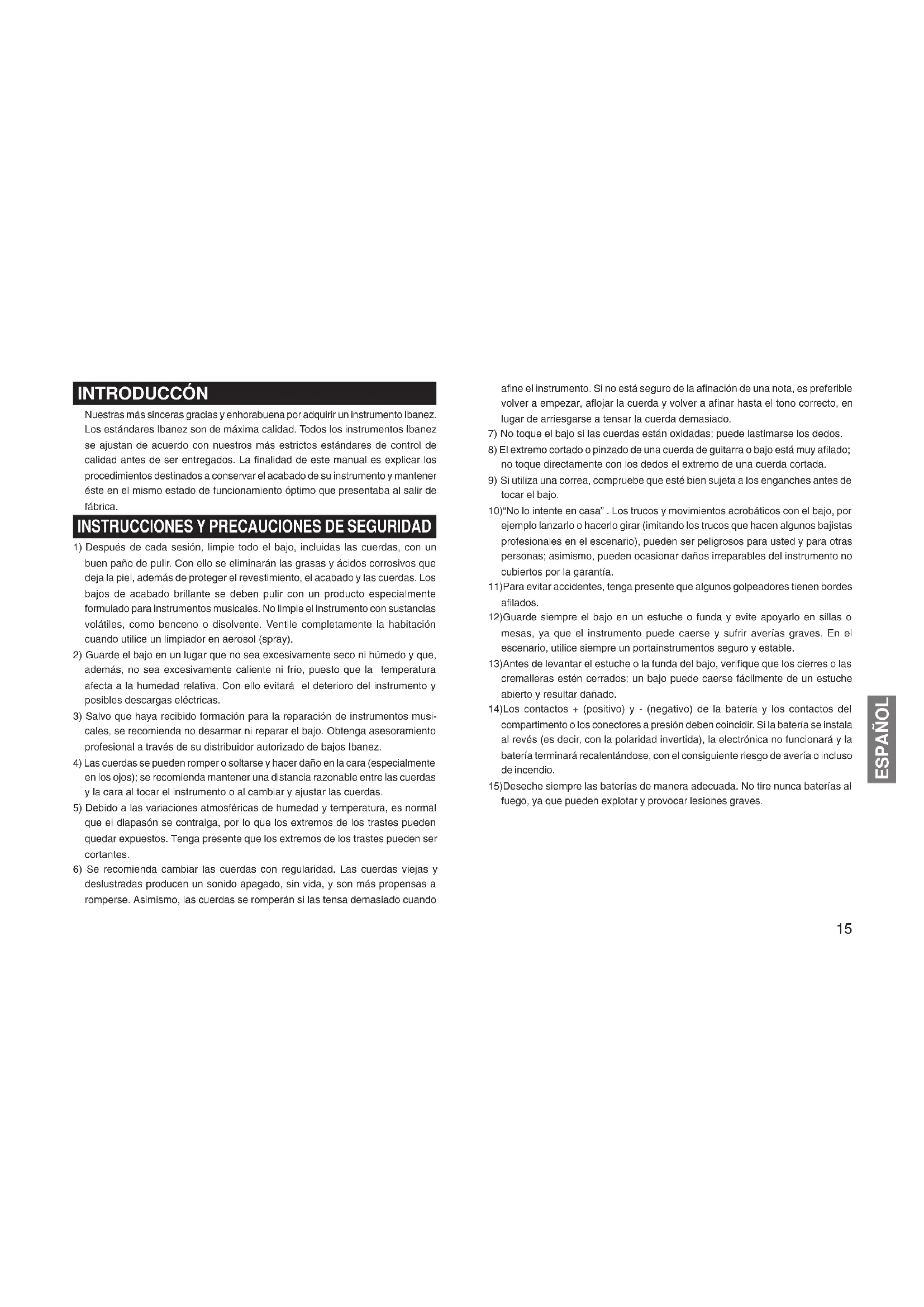 tocar el bajo. 10)“No lo intente en casa” . Los trucos y movimientos acrobáticos con el bajo, por ejemplo lanzarlo o hacerlo girar (imitando los trucos que hacen algunos bajistas profesionales en el escenario), pueden ser peligrosos para usted y para otras personas; asimismo, pueden ocasionar daños irreparables del instrumento no cubiertos por la garantía. 11)Para evitar accidentes, tenga presente que algunos golpeadores tienen bordes afilados. 12)Guarde siempre el bajo en un estuche o funda y evite apoyarlo en sillas o mesas, ya que el instrumento puede caerse y sufrir averías graves. En el escenario, utilice siempre un portainstrumentos seguro y estable. 13)Antes de levantar el estuche o la funda del bajo, verifique que los cierres o las cremalleras estén cerrados; un bajo puede caerse fácilmente de un estuche abierto y resultar dañado. 14)Los contactos + (positivo) y - (negativo) de la batería y los contactos del compartimento o los conectores a presión deben coincidir. Si la batería se instala al revés (es decir, con la polaridad invertida), la electrónica no funcionará y la batería terminará recalentándose, con el consiguiente riesgo de avería o incluso de incendio. 15)Deseche siempre las baterías de manera adecuada. No tire nunca baterías al fuego, ya que pueden explotar y provocar lesiones graves.16 ESPAÑOL MÁSTIL Los modelos Ibanez para cuerdas de acero están provistos de un alma ajustable. La finalidad del alma es ajustar el mástil para contrarrestar la tensión de las cuerdas. Existen numerosas razones para ajustar el alma. Una de las razones más comunes es el cambio del espesor de las cuerdas o la modificación del tono de afinación; en ambos casos se altera la tensión de las cuerdas. Los cambios de tensión de las cuerdas pueden afectar a la altura de estas y provocar trasteos o desajustes de las notas. Para ajustar el alma, localice la tuerca, introduzca en ella la llave correcta y apriétela (hacia la derecha) o aflójela (hacia la izquierda). La tensión del alma se puede medir colocando una cejilla en el primer traste y sujetando las cuerdas en la posición del traste donde se unen el mástil y el cuerpo de la guitarra. Inserte una galga de espesores entre la cuerda y el 8º traste. Debe haber una holgura de 0,3 mm a 0,5 mm entre medio. Dicha holgura se denomina «holgura del mástil»; si es excesiva, la acción será más intensa en el medio del mástil y provocará una entonación deficiente, al tiempo que resultará incómodo tocar el instrumento. La ausencia de holgura del mástil puede provocar trasteo. *El ajuste del mástil requiere un cuidado especial y recomendamos que este procedimiento lo realicen únicamente técnicos cualificados. CUERDAS Si las cuerdas se ensucian, se decoloran o producen un sonido apagado o un zumbido, sustitúyelas por unas nuevas. Para lograr un resultado óptimo, recomendamos cambiar las cuerdas de una en una a fin de mantener la tensión necesaria en el mástil. Cuando sustituyas cuerdas de calibres diferentes, será necesario ajustar la tensión del alma. (Se recomienda confiar esta operación únicamente a técnicos cualificados). Los bajos Ibanez salen de fábrica equipados con cuerdas del siguiente calibre. Observa la instrucciones siguientes para su modelo concreto. Las cuerdas se deben enrollar bien apretadas, con 2 ó 3 vueltas de arriba abajo alrededor de la clavija. En el caso de clavijeros en los que los extremos de las cuerdas se insertan en las clavijas, la cuerda se puede cortar previamente a la longitud adecuada con unos alicates. Si el clavijero tiene los engranajes sellados, dichos engranajes se autolubrican. Los tornillos de ajuste colocados en la palomilla de la clavija se pueden apretar con un destornillador tipo Phillips pequeño para aumentar la tensión. *El uso de cuerdas bastas puede originar zumbidos y distorsión del sonido. El uso de cuerdas que tengan torceduras o pliegues puede provocar zumbidos o reducir el sustain. Comprueba que las cuerdas nuevassean lisas y carezcan de defectos antes de instalarlas. Para instalar una cuerda, pásela por el orificio de la parte posterior del cordal y llévela hacia arriba, por encima de la silleta.En el caso de puentes que requieran instrucciones especiales, consulte el apéndice al final de este manual. APRETAR AFLOJAR APRETAR AFLOJAR APRETAR AFLOJAR 0,3 ~ 0,5 mm 8º traste MODEL 4 String Basses 5 String Basses 6 String Basses STRING GAUGE .045, .065, .085, .105" .045, .065, .085, .105, .130" .032, .045, .065, .085, .105, .130"17 ESPAÑOL OCTAVACIÓN La octavación es la operación de ajustar la posición de las cuerdas en la silleta del puente para compensar las variaciones de afinación. Observa las instrucciones siguientes para la octavación correcta del puente. La octavación es correcta cuando la nota pulsada en el 12º traste y el armónico del mismo 12º traste son exactamente la misma nota. Es el punto central de la cuerda y la forma más precisa de ajustar la longitud estándar de la escala del instrumento. Usando la nota armónica como referencia, si la nota pulsada en el traste es bemol, desplace la silleta del puente hacia delante, es decir hacia la cejuela (a), para reducir la longitud de la cuerda. Si la nota pulsada en el traste es sostenida, desplace la silleta hacia atrás, es decir alejándola de la cejuela (b) para incrementar la longitud de la cuerda. *Tenga en cuenta que cuando se mueve la silleta del puente las cuerdas se pueden romper; por tanto, afloje siempre las cuerdas antes de efectuar el ajuste. La octavación puede efectuarse ajustando los tornillos de octavación situados en la parte posterior del puente; al girarlos en el sentido de las agujas del reloj la silleta se desplaza hacia atrás y al girarlos en el sentido contrario al de las agujas del reloj la silleta se desplaza hacia delante. ACCIÓN La acción (distancia entre los trastes y la cuerda) del bajo Ibanez se ajusta en fábrica. No obstante, la altu