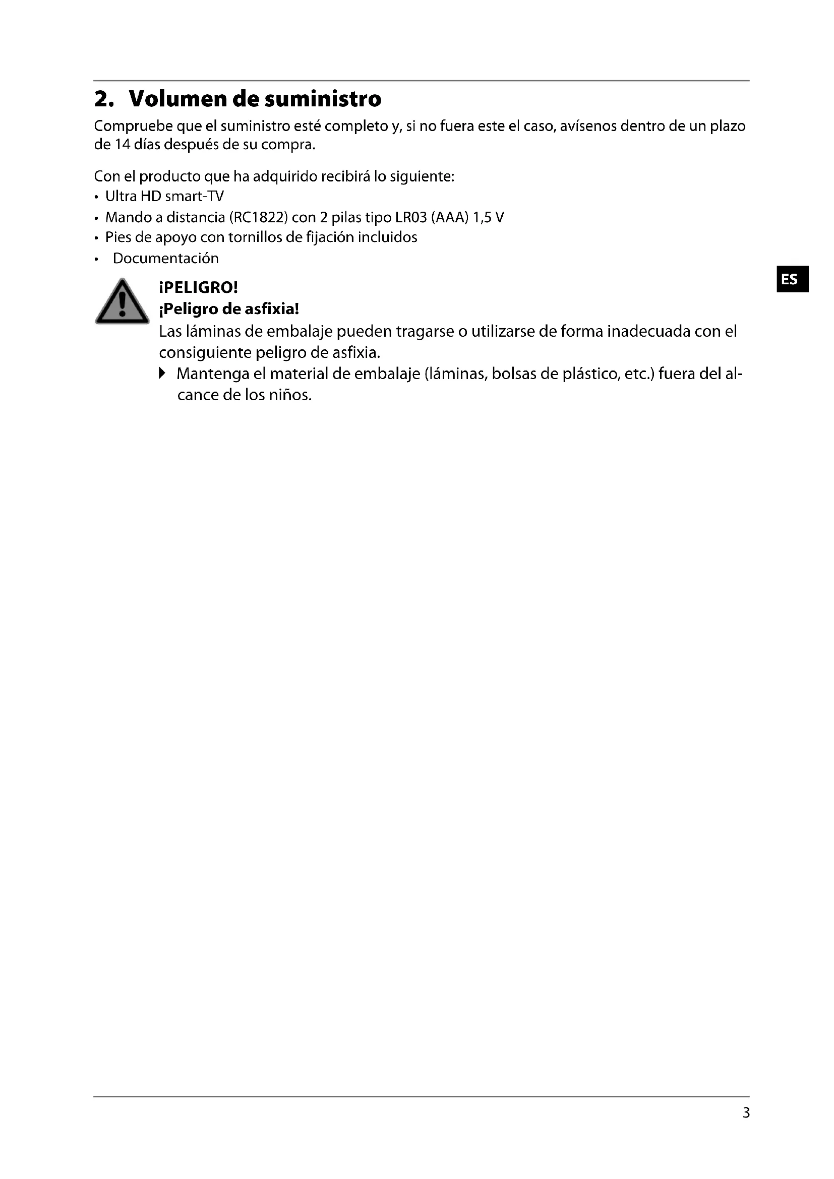 - Guarde bien el material de embalaje y utilícelo únicamente para transportar el televisor. PELIGRO! ¡Peligro de asfixia! Las láminas de embalaje pueden tragarse o utilizarse de forma inadecuada con el consiguiente peligro de asfixia. Mantenga el material de embalaje (láminas, bolsas de plástico, etc.) fuera del al- cance de los niños.