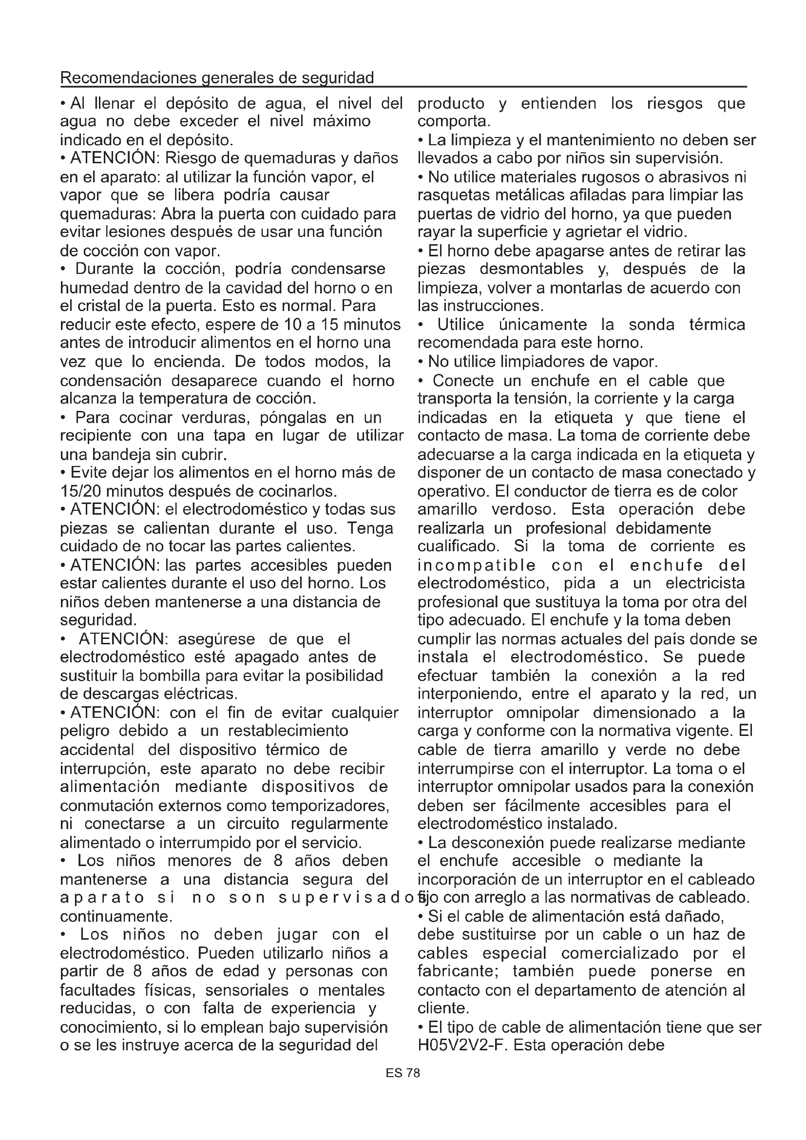 - El tipo de cable de alimentación tiene que ser H05V2V2-F. Esta operación debe ES 78realizarla un profesional debidamente cualificado. El conductor de toma de tierra (amarillo-verde), debe ser aproximadamente 10 mm más largo que los otros conductores. Para cualquier reparación, diríjase únicamente a un centro de asistencia técnica autorizado y solicite que se empleen recambios originales.