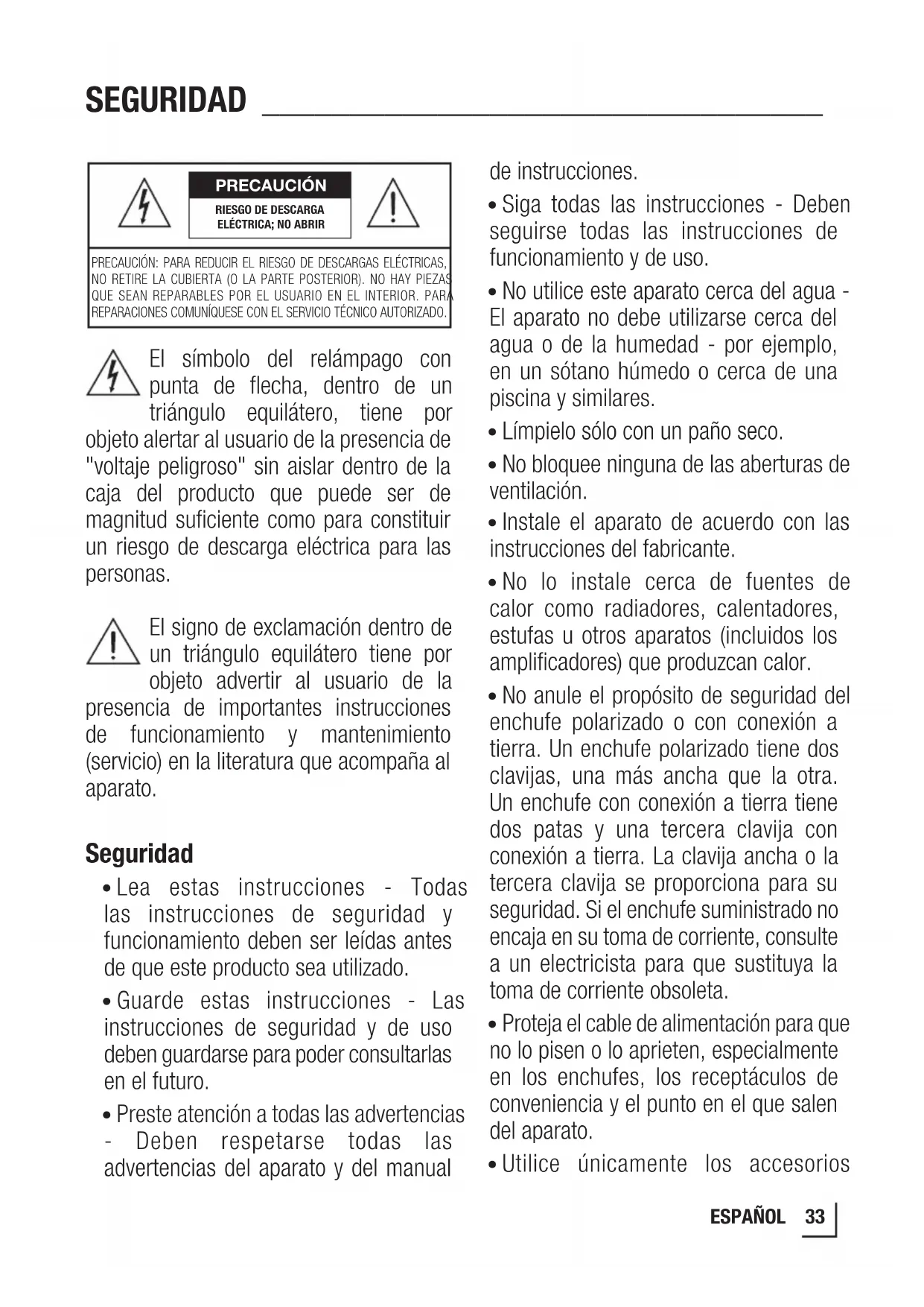 - Utilice únicamente los accesorios PRECAUCIÓN PRECAUCIÓN: PARA REDUCIR EL RIESGO DE DESCARGAS ELÉCTRICAS, NO RETIRE LA CUBIERTA (O LA PARTE POSTERIOR). NO HAY PIEZAS QUE SEAN REPARABLES POR EL USUARIO EN EL INTERIOR. PARA REPARACIONES COMUNÍQUESE CON EL SERVICIO TÉCNICO AUTORIZADO.RIESGO DE DESCARGA ELÉCTRICA; NO ABRIR34 ESPAÑOL SEGURIDAD ________________________________ especificados por el fabricante.
