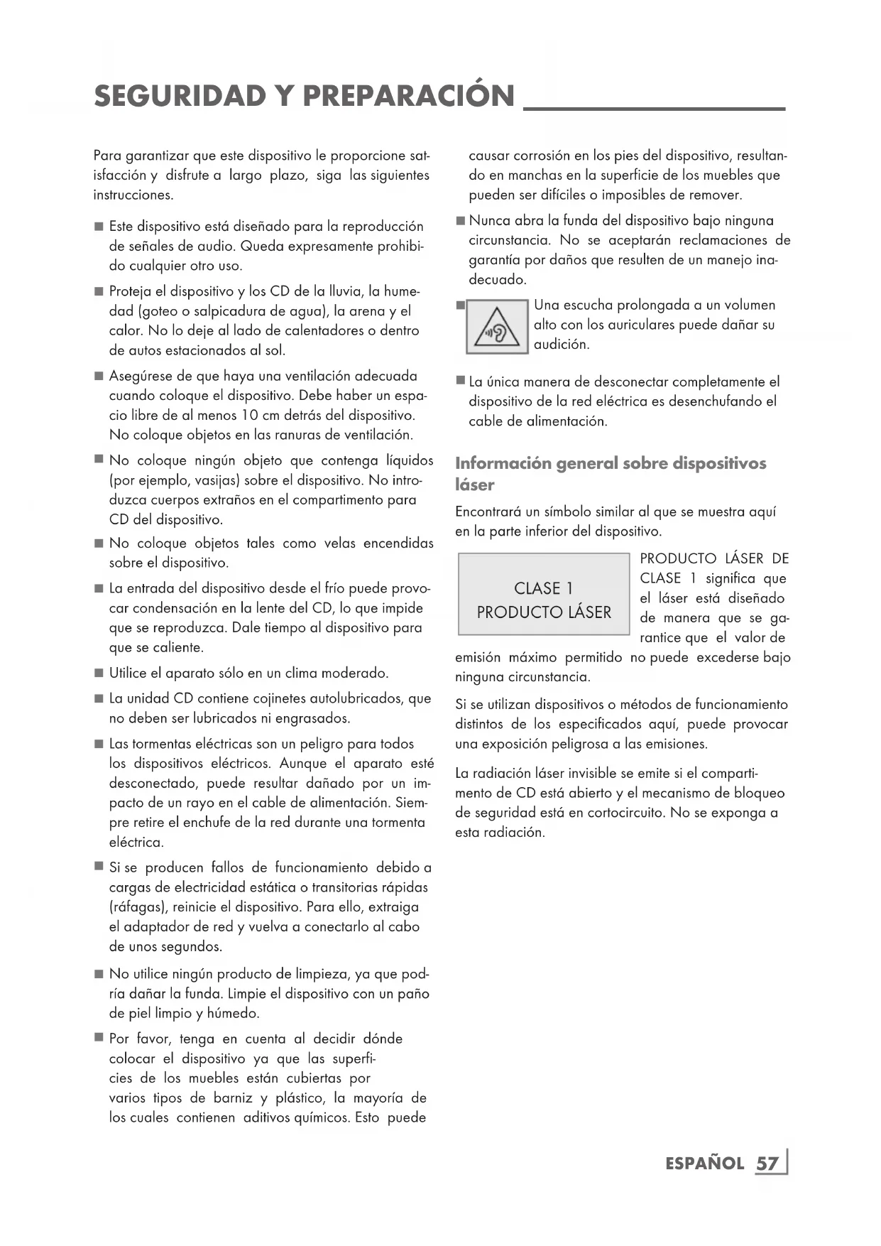 CLASE 1 significa que el láser está diseñado de manera que se ga- rantice que el valor de emisión máximo permitido no puede excederse bajo ninguna circunstancia. Si se utilizan dispositivos o métodos de funcionamiento distintos de los especificados aquí, puede provocar una exposición peligrosa a las emisiones. La radiación láser invisible se emite si el comparti- mento de CD está abierto y el mecanismo de bloqueo de seguridad está en cortocircuito. No se exponga a esta radiación. Para garantizar que este dispositivo le proporcione sat- isfacción y disfrute a largo plazo, siga las siguientes instrucciones.