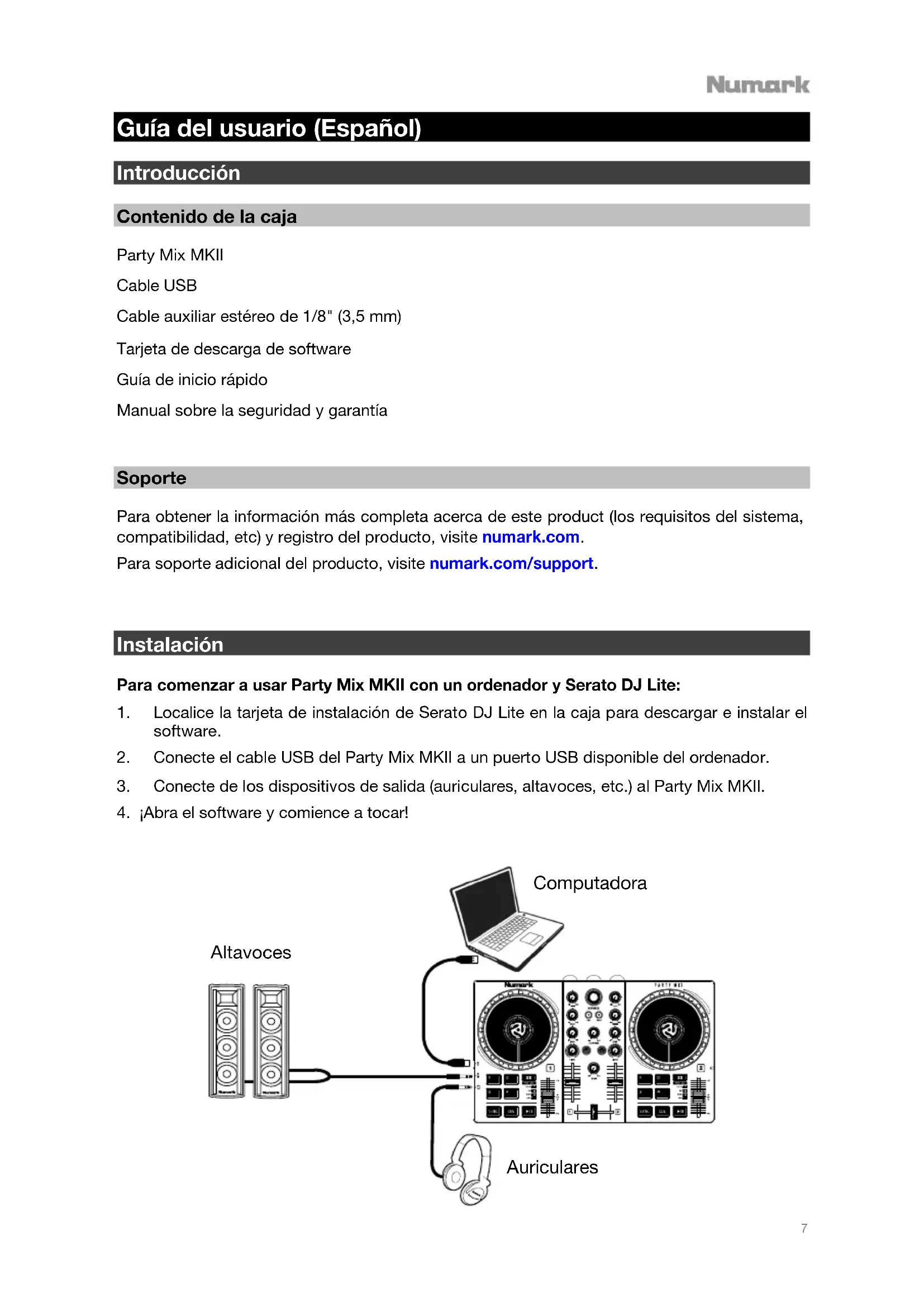 Soporte Para obtener la información más completa acerca de este product (los requisitos del sistema, compatibilidad, etc) y registro del producto, visite numark.com. Para soporte adicional del producto, visite numark.com/support.