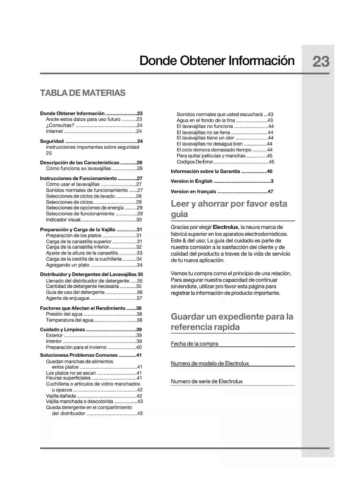 - Queda detergente en el compartimiento del distribuidor Fecha de la compra Numero de modelo de Electrolux Leer y ahorrar por favor esta guia Guardar un expediente para la referencia rapida Gracias por elegir Electrolux, la neuva marca de fabricá superior en los aparatos electrodomísticos. Este & del uso; La guía del cuidado es parte de nuestra comisión a la saisfacción del cliente y de calidad del producto a traves de la vida de servicio de tu nueva aplicación. Vemos tu compra como el principio de una relación. Para asegurar nuestra capacidad de continuar sirviendote, utilizar pro favor esta página para registrar la información de producto importante. Numero de serie de Electrolux Donde Obtener Información p. 43