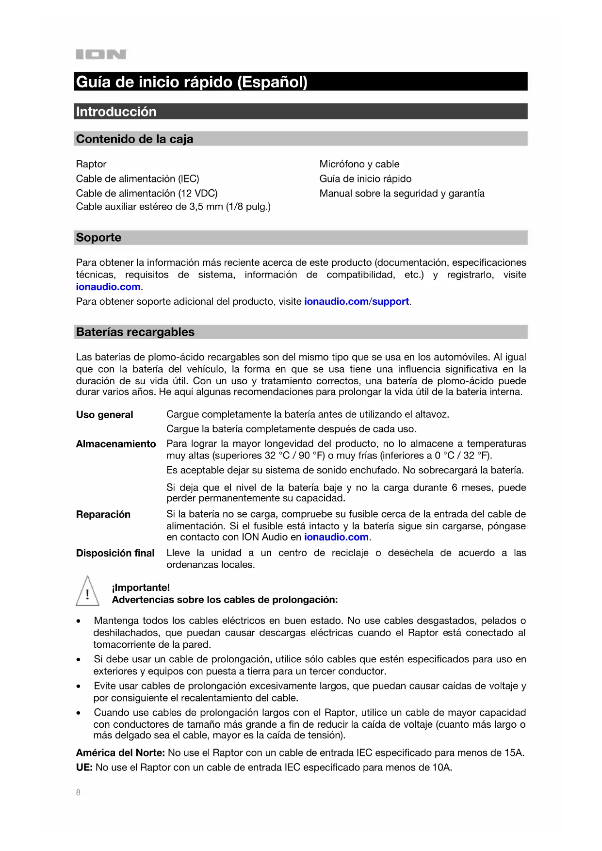 Guía de inicio rápido (Español) Introducción Contenido de la caja Raptor Cable de alimentación (IEC) Cable de alimentación (12 VDC) Cable auxiliar estéreo de 3,5 mm (1/8 pulg.) Micrófono y cable Guía de inicio rápido Manual sobre la seguridad y garantía Soporte Para obtener la información más reciente acerca de este producto (documentación, especificaciones técnicas, requisitos de sistema, información de compatibilidad, etc.) y registrarlo, visite ionaudio.com. Para obtener soporte adicional del producto, visite ionaudio.com/support. Baterías recargables Las baterías de plomo-ácido recargables son del mismo tipo que se usa en los automóviles. Al igual que con la batería del vehículo, la forma en que se usa tiene una influencia significativa en la duración de su vida útil. Con un uso y tratamiento correctos, una batería de plomo-ácido puede durar varios años. He aquí algunas recomendaciones para prolongar la vida útil de la batería interna. Uso general Cargue completamente la batería antes de utilizando el altavoz. Cargue la batería completamente después de cada uso. Almacenamiento Para lograr la mayor longevidad del producto, no lo almacene a temperaturas muy altas (superiores 32 °C / 90 °F) o muy frías (inferiores a 0 °C / 32 °F). Es aceptable dejar su sistema de sonido enchufado. No sobrecargará la batería. Si deja que el nivel de la batería baje y no la carga durante 6 meses, puede perder permanentemente su capacidad. Reparación Si la batería no se carga, compruebe su fusible cerca de la entrada del cable de alimentación. Si el fusible está intacto y la batería sigue sin cargarse, póngase en contacto con ION Audio en ionaudio.com. Disposición final Lleve la unidad a un centro de reciclaje o deséchela de acuerdo a las ordenanzas locales. ¡Importante! Advertencias sobre los cables de prolongación: