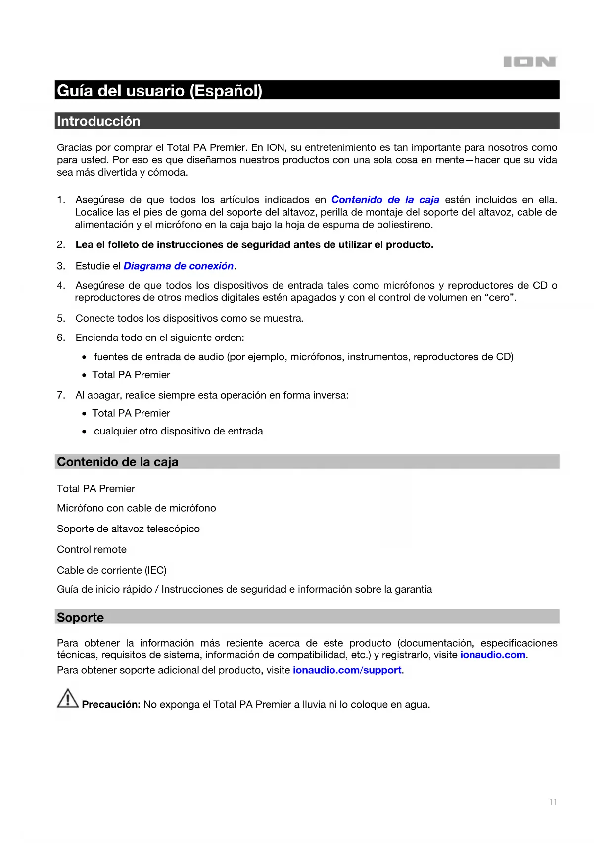 Guía del usuario (Español) Introducción Gracias por comprar el Total PA Premier. En ION, su entretenimiento es tan importante para nosotros como para usted. Por eso es que diseñamos nuestros productos con una sola cosa en mente—hacer que su vida sea más divertida y cómoda.