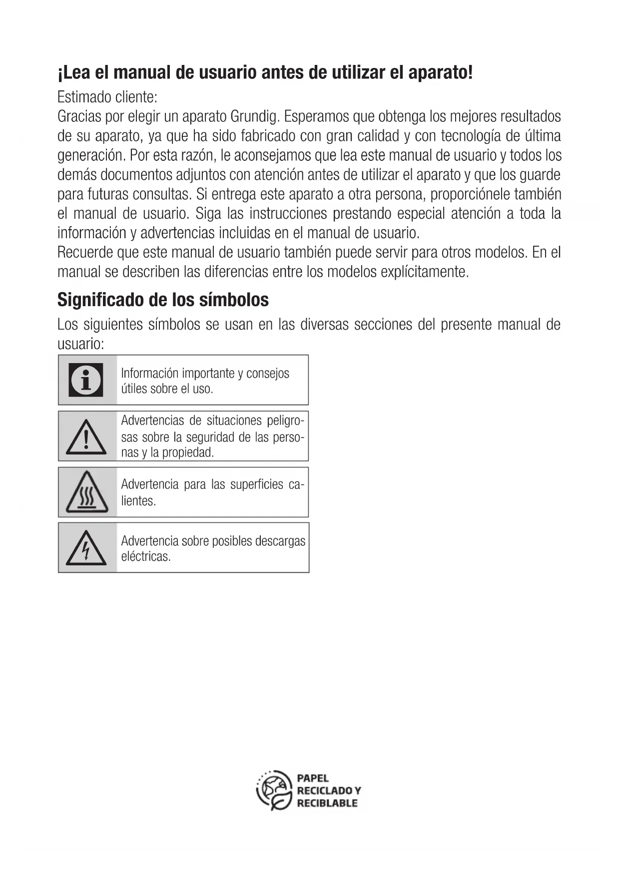 apre (per un'ostruzione avanti allo sportello, bassa tensione, ecc.) Scollegare. Poi ricollegare di nuovo dopo 10 secondi.www.grundig.it¡Lea el manual de usuario antes de utilizar el aparato! Estimado cliente: Gracias por elegir un aparato Grundig. Esperamos que obtenga los mejores resultados de su aparato, ya que ha sido fabricado con gran calidad y con tecnología de última generación. Por esta razón, le aconsejamos que lea este manual de usuario y todos los demás documentos adjuntos con atención antes de utilizar el aparato y que los guarde para futuras consultas. Si entrega este aparato a otra persona, proporciónele también el manual de usuario. Siga las instrucciones prestando especial atención a toda la información y advertencias incluidas en el manual de usuario. Recuerde que este manual de usuario también puede servir para otros modelos. En el manual se describen las diferencias entre los modelos explícitamente. Significado de los símbolos Los siguientes símbolos se usan en las diversas secciones del presente manual de usuario: