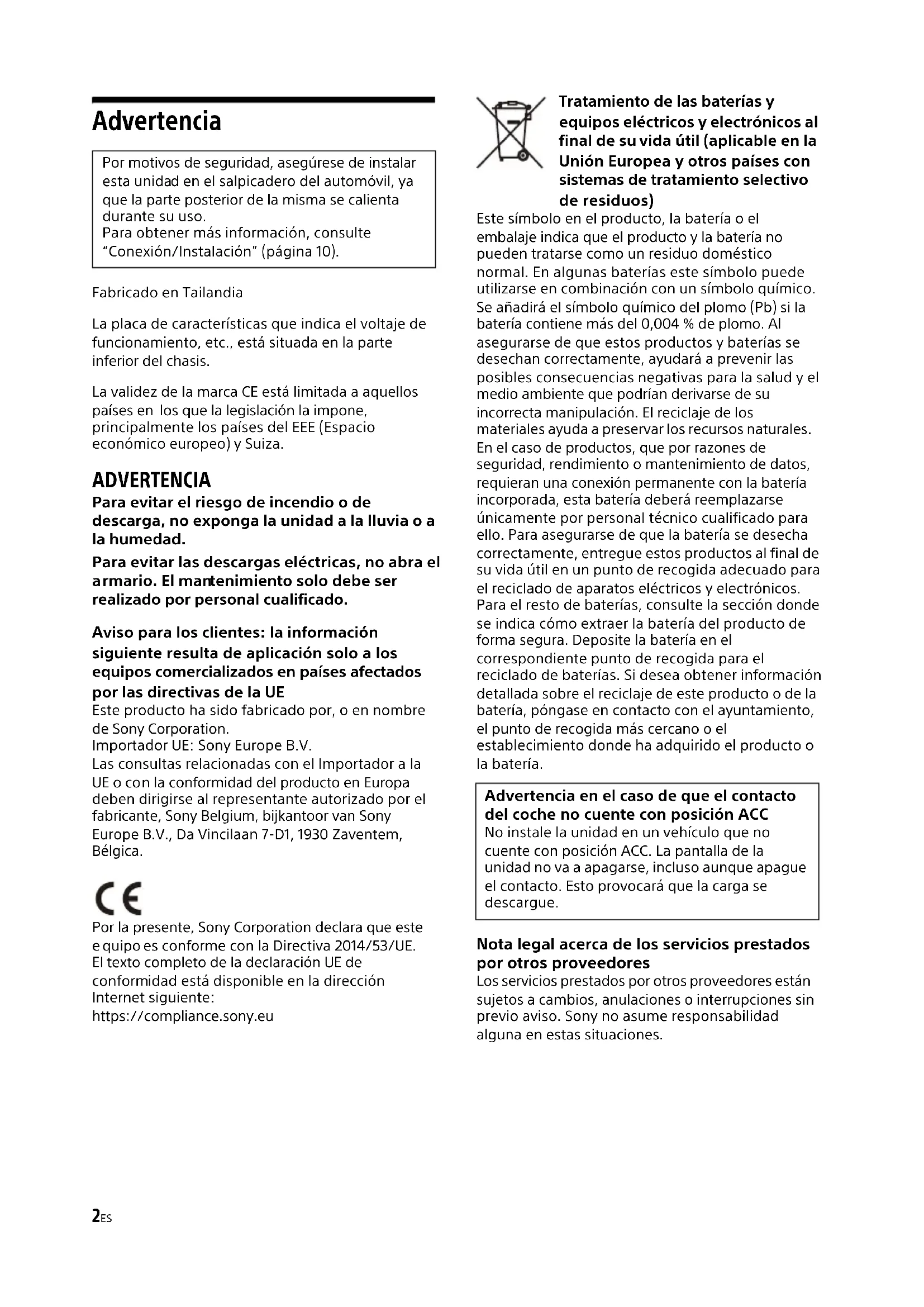 rmario. El man tenimiento solo debe ser realizado por personal cualificado. Aviso para los clientes: la información siguiente resulta de aplicación solo a los equipos comercializados en países afectados por las directivas de la UE Este producto ha sido fabricado por, o en nombre de Sony Corporation.Importador UE: Sony Europe B.V.Las consultas relacionadas con el Importador a la UE o con la conformidad del producto en Europa deben dirigirse al representante autorizado por el fabricante, Sony Belgium, bijkantoor van Sony Europe B.V., Da Vincilaan 7-D1, 1930 Zaventem, Bélgica.Por la presente, Sony Corporation declara que este quipo es conforme con la Directiva 2014/53/UE.El texto completo de la declaración UE de conformidad está disponible en la dirección Internet siguiente: https://compliance.sony.eu Tratamiento de las baterías y equipos eléctricos y electrónicos al final de su vida útil (aplicable en la Unión Europea y otros países con sistemas de tratamiento selectivo de residuos) Este símbolo en el producto, la batería o el embalaje indica que el producto y la batería no pueden tratarse como un residuo doméstico normal. En algunas baterías este símbolo puede utilizarse en combinación con un símbolo químico. Se añadirá el símbolo químico del plomo (Pb) si la batería contiene más del 0,004 % de plomo. Al asegurarse de que estos productos y baterías se desechan correctamente, ayudará a prevenir las posibles consecuencias negativas para la salud y el medio ambiente que podrían derivarse de su incorrecta manipulación. El reciclaje de los materiales ayuda a preservar los recursos naturales. En el caso de productos, que por razones de seguridad, rendimiento o mantenimiento de datos, requieran una conexión permanente con la batería incorporada, esta batería deberá reemplazarse únicamente por personal técnico cualificado para ello. Para asegurarse de que la batería se desecha correctamente, entregue estos productos al final de su vida útil en un punto de recogida adecuado para el reciclado de aparatos eléctricos y electrónicos. Para el resto de baterías, consulte la sección donde se indica cómo extraer la batería del producto de forma segura. Deposite la batería en el correspondiente punto de recogida para el reciclado de baterías. Si desea obtener información detallada sobre el reciclaje de este producto o de la batería, póngase en contacto con el ayuntamiento, el punto de recogida más cercano o el establecimiento donde ha adquirido el producto o la batería. Nota legal acerca de los servicios prestados por otros proveedores Los servicios prestados por otros proveedores están sujetos a cambios, anulaciones o interrupciones sin previo aviso. Sony no asume responsabilidad alguna en estas situaciones.Por motivos de seguridad, asegúrese de instalar esta unidad en el salpicadero del automóvil, ya que la parte posterior de la misma se calienta durante su uso.Para obtener más información, consulte “Conexión/Instalación” (página 10). Advertencia en el caso de que el contacto del coche no cuente con posición ACC No instale la unidad en un vehículo que no cuente con posición ACC. La pantalla de la unidad no va a apagarse, incluso aunque apague el contacto. Esto provocará que la carga se descargue.3ES Precaución SONY NO SE HACE RESPONSABLE EN NINGÚN CASO DE DAÑOS ACCIDENTALES, INDIRECTOS, COLATERALES O DE OTRO TIPO, LO QUE INCLUYE, A TÍTULO MERAMENTE ENUNCIATIVO, LA PÉRDIDA DE BENEFICIOS, LA PÉRDIDA DE INGRESOS, LA PÉRDIDA DE DATOS, LA IMPOSIBILIDAD DE UTILIZAR EL PRODUCTO O EQUIPOS ASOCIADOS, EL TIEMPO DE INACTIVIDAD O EL TIEMPO DEL COMPRADOR EN RELACIÓN CON LA UTILIZACIÓN DE ESTE PRODUCTO, SU HARDWARE Y/O SU SOFTWARE. Tenga en cuenta que este producto incluye un transmisor d e radio. Según la norma 10 de UNECE, un fabricante de un vehículo puede imponer condiciones específicas para la instalación de transmisores de radio en los vehículos. Consulte el manual de instrucciones de su vehículo o póngase en con tacto con el concesionario de su vehículo antes de instalar este producto en su vehículo. Llamadas de emergencia Este sistema manos libres para vehículo BLUETOOTH y el dispositivo electrónico conectado al mismo funcionan mediante señales de radio, redes de telefonía móvil y redes terrestres, así como a través de funciones programadas por el usuario, por lo que la conexión no está garantizada en todas las condiciones. Por tanto, no confíe exclusivamente en un solo