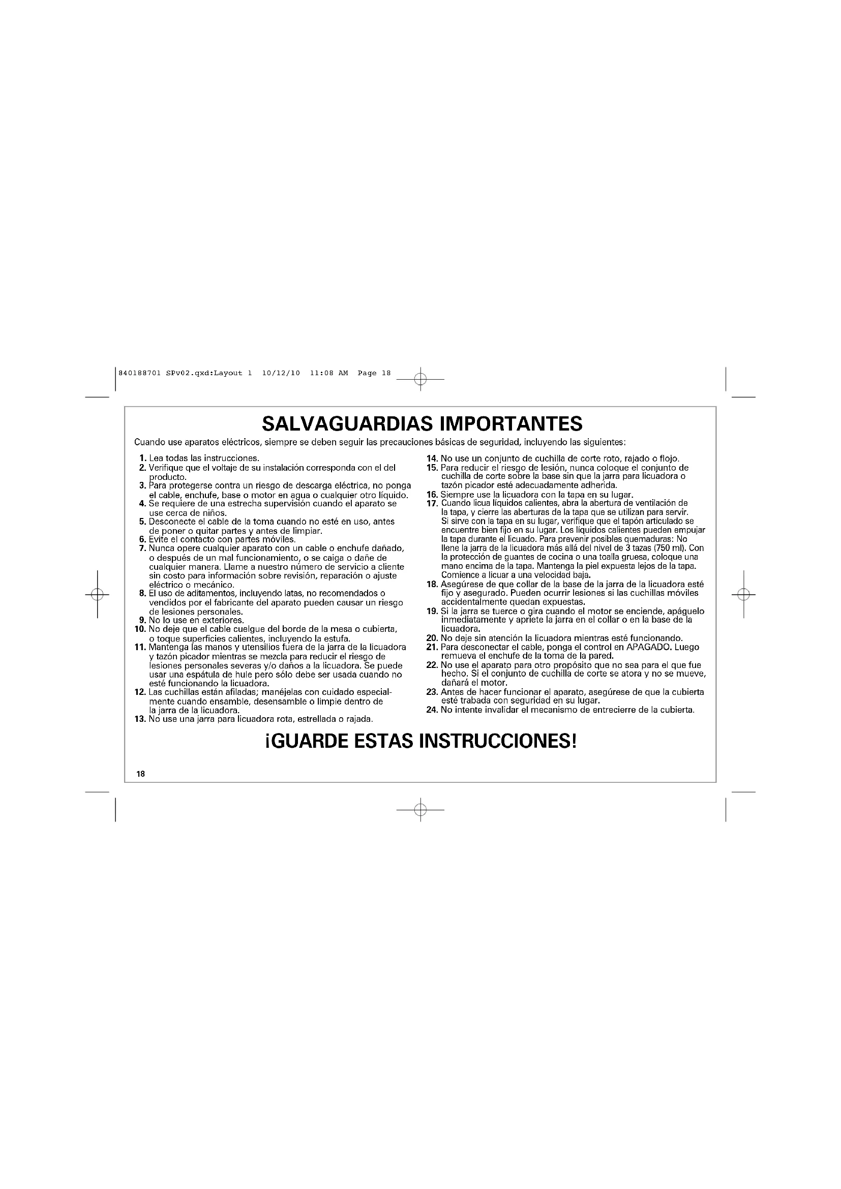 Cuando use aparatos eléctricos, siempre se deben seguir las precauciones básicas de seguridad, incluyendo las siguientes: ¡GUARDE ESTAS INSTRUCCIONES! 840188701 SPv02.qxd:Layout 1 10/12/10 11:08 AM Page 1819 OTRA INFORMACIÓN DE SEGURIDAD PARA EL CLIENTE Este aparato está planeado para uso doméstico. ¡ADVERTENCIA! Peligro de Descarga: Este aparato tiene un enchufe polarizado (una clavija ancha) que reduce el riesgo de descarga eléctrica. El enchufe se ajusta sólo de un manera en una toma polar- izada. No venza el propósito de seguridad del enchufe al modificarlo en ninguna forma o usando un adaptador. Si el enchufe no entra, invierta el enchufe. Si aún no entra, haga que un eléctrico reemplace la toma. La longitud del cable usado para este aparato fue seleccionado para reducir los riesgos de enredarse, o tropezarse, con un cable más largo. Si se necesita un cable más largo, se puede usar un cable extensión aprobado. La clasificación eléctrica de la cable extensión debe ser igual o mayor que la clasificación de la licuadora. Se debe de tener cuidado de acomodar el cable extensión de manera que no cuelgue de una cubierta o mesa y que pueda ser jalado por un niño o pueda provocar un tropiezo accidental. Si el conjunto de cuchilla de corte se atora y no se mueve, dañará el motor. No la use. Llame a nuestro número de asistencia al cliente sin costo para información. No coloque la jarra de la licuadora en el congelador lleno de comida o líquido. Esto puede resultar en un daño del conjunto de cuchilla de corte, jarra, licuadora y resulte posiblemente en lesiones personales. La clasificación del wattaje/amperaje de la licuadora se determina por una prueba de Laboratorio del Suscriptor y está basada en las combinaciones de conjunto de cuchilla de corte y jarra disponibles que pueden no proporcionarse con su unidad, pero están disponibles como partes de reemplazo. Esta es una medida de entrada de watts/amperes después de 30 segundos de operación. La licuadora como se provee puede tomar significativamente menos energía. La energía tope es la medida del wattaje del motor durante los primeros segundos de operación. Esto es cuando la licuadora requiere la mayor energía para cortar hielo, fruta congelada, etc. Esta es una mejor medición de lo que un motor de licuadora puede consumir cuando más se requiere energía. ANTES DE USAR POR PRIMERA VEZ: Después de desempacar la licuadora, lave todo excepto la base de la licuadora en agua caliente jabonosa. Seque completamente. Limpie la base de la licuadora con un paño húmedo o esponja. NO SUMERJA LA BASE EN AGUA. Se debe de tener cuidado cuando se manipule el conjunto de cuchilla cortadora ya que está muy afilada. Información sobre Watts/Energía Tope 840188701 SPv02.qxd:Layout 1 10/12/10 11:08 AM Page 1920 Piezas y Características Pico Libre de Derrames con Tapón Articulado Jarra de Licuadora Base Conjunto de Cuchilla de Corte NOTA: El empaque está fijado permanentemente a las cuchillas de corte. No intente removerlo. Collar Almacenaje de Cable (localizado en la parte inferior de la base) Abertura de Ventilacion Tapa Accesorio Picador de Alimentos (accessorios optional en modelos selectos) Tapa Tazón Picador Cuchilla en S Base de Tazón 840188701 SPv02.qxd:Layout 1 10/12/10 11:08 AM Page 2021 Cómo usar su licuadora ANTES DE USAR POR PRIMERA VEZ: Después de desempacar la licuadora, siga las instrucciones en “Cómo limpiar su licuadora”. IMPORTANTE: La jarra de su licuadora y el conjunto de cuchilla de corte están sujetos a desgaste durante el uso normal. Siempre inspeccione la jarra por cortes, astillas o rajaduras. Siempre inspeccione el conjunto de cuchilla de corte por cortes, rajaduras o cuchillas sueltas. Si la jarra o el conjunto de cuchilla de corte están dañados, no los use. Llame a nuestro número de servicio a cliente sin costo para obtener piezas de reemplazo.