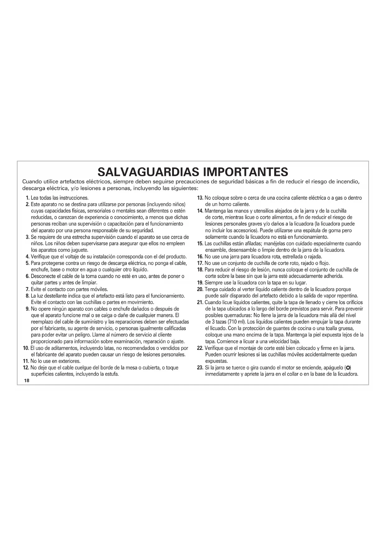 inmediatamente y apriete la jarra en el collar o en la base de la licuadora. Cuando utilice artefactos eléctricos, siempre deben seguirse precauciones de seguridad básicas a fin de reducir el riesgo de incendio, descarga eléctrica, y/o lesiones a personas, incluyendo las siguientes:19 Otra Información de Seguridad para el Cliente Este aparato ha sido diseñado solamente para uso doméstico. Sólo úselo para alimentos o líquidos. w ADVERTENCIA Peligro de Descarga Eléctrica: Este aparato es provisto con un enchufe polarizado (una pata más ancha) para reducir el riesgo de una descarga eléctrica. El enchufe embona únicamente en una dirección dentro de un tomacorriente polarizado. No trate de obviar el propósito de seguridad del enchufe modificándolo de alguna manera o utilizando un adaptador. Si el enchufe no entra completamente en la toma, invierta el enchufe. Si aún no entra, haga que un electricista reemplace la toma. El largo del cable que se usa en este aparato fue seleccionado para reducir el peligro de que alguien se enganche o tropiece con un cable más largo. Si es necesario usar un cable más largo, se podrá usar un cable de extensión aprobado. La clasificación eléctrica nominal del cable de extensión debe ser igual o mayor que la clasificación nominal del aparato. Es importante tener cuidado de colocar el cable de extensión para que no se pliegue sobre el mostrador o la mesera en donde niños puedan tirar del mismo o tropezarse accidentalmente. Si el conjunto de cuchilla de corte se atora y no se mueve, dañará el motor. No la use. Llame al centro de atención al cliente para obtener información. No coloque la jarra de la licuadora en el congelador lleno de comida o líquido. Esto puede resultar en un daño del conjunto de cuchilla de corte, jarra, licuadora y resulte posiblemente en lesiones personales. La clasificación del wattaje/amperaje de la licuadora se determina por una prueba de Laboratorio del Suscriptor y está basada en las combinaciones de conjunto de cuchilla de corte, jarra, y accesorios disponibles que pueden no proporcionarse con su unidad, pero están disponibles como partes de reemplazo. Esta es una medida de entrada de watt/amperes después de 30 segundos de operación. La licuadora como se provee puede tomar significativamente menos energía. La energía pico es la medida del wattaje del motor durante los primeros segundos de operación. Esto es cuando la licuadora requiere la mayor energía para cortar hielo, fruta congelada, etc. Esta es una mejor medición de lo que un motor de licuadora puede consumir cuando más se requiere energía. Información sobre Watt/Energía Pico