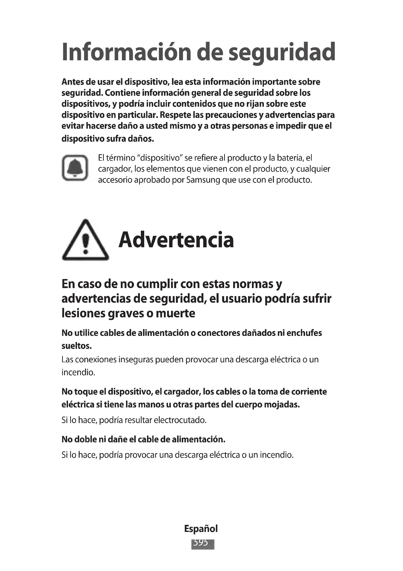 Información de seguridad Antes de usar el dispositivo, lea esta información importante sobre seguridad. Contiene información general de seguridad sobre los dispositivos, y podría incluir contenidos que no rijan sobre este dispositivo en particular. Respete las precauciones y advertencias para evitar hacerse daño a usted mismo y a otras personas e impedir que el dispositivo sufra daños.El término “dispositivo” se refiere al producto y la batería, el cargador, los elementos que vienen con el producto, y cualquier accesorio aprobado por Samsung que use con el producto. Advertencia En caso de no cumplir con estas normas y advertencias de seguridad, el usuario podría sufrir lesiones graves o muerte No utilice cables de alimentación o conectores dañados ni enchufes sueltos.Las conexiones inseguras pueden provocar una descarga eléctrica o un incendio.No toque el dispositivo, el cargador, los cables o la toma de corriente eléctrica si tiene las manos u otras partes del cuerpo mojadas.Si lo hace, podría resultar electrocutado.No doble ni dañe el cable de alimentación.Si lo hace, podría provocar una descarga eléctrica o un incendio.Español