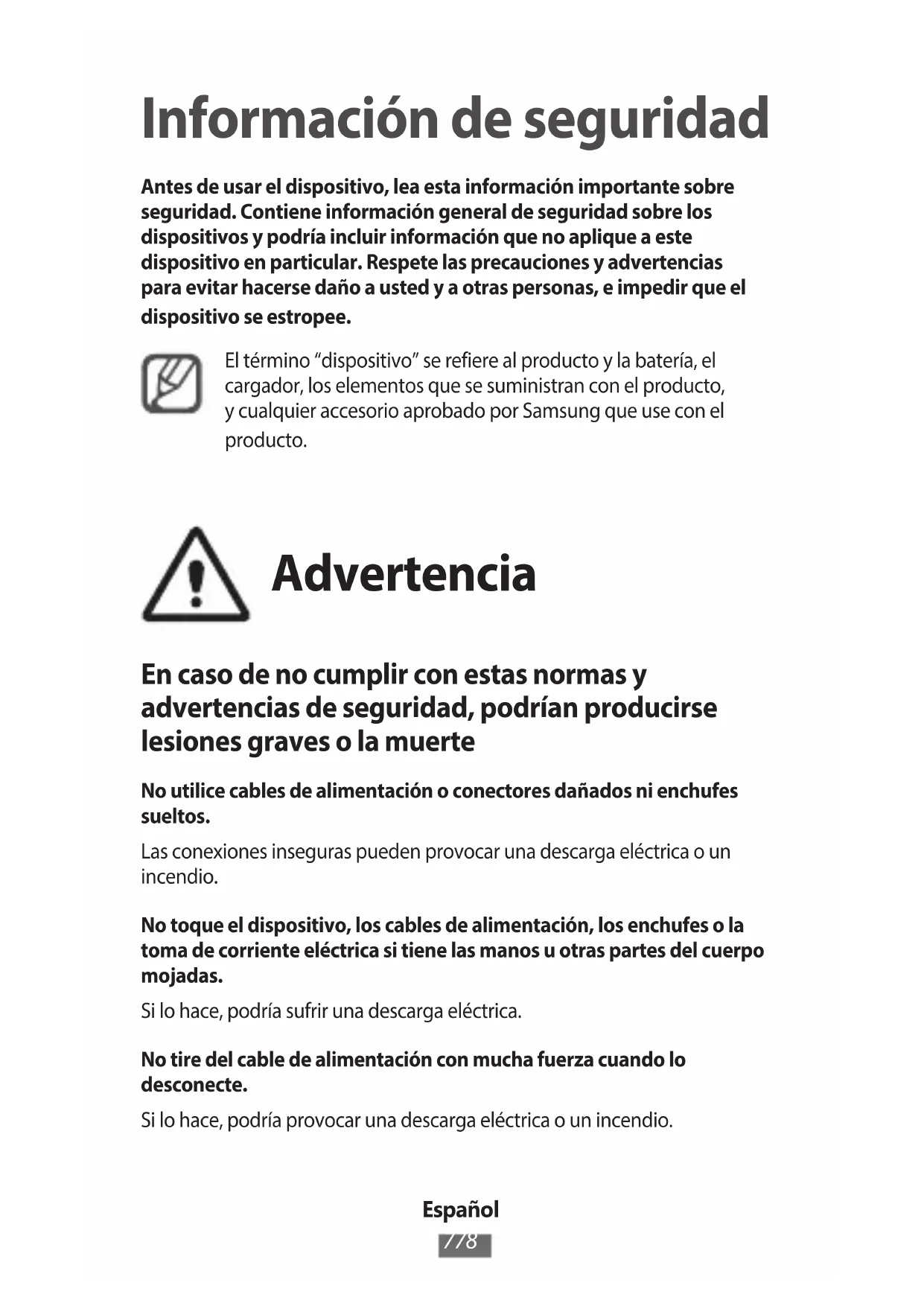 Información sobre seguridad Antes de usar el dispositivo, lea esta información importante sobre seguridad. Contiene información general de seguridad sobre los dispositivos, y podría incluir contenidos que no rijan sobre este dispositivo en particular. Respete las precauciones y advertencias para evitar hacerse daño a usted mismo y a otras personas e impedir que el dispositivo sufra daños.El término “dispositivo” se refiere al producto y la batería, el cargador, los elementos que vienen con el producto, y cualquier accesorio aprobado por Samsung que use con el producto. Advertencia En caso de no cumplir con estas normas y advertencias de seguridad, el usuario podría sufrir lesiones graves o muerte No utilice cables de alimentación o conectores dañados ni enchufes sueltosLas conexiones inseguras pueden provocar una descarga eléctrica o un incendio.No toque el dispositivo, los cables de alimentación, los enchufes o la toma eléctrica con las manos mojados o con otras partes del cuerpo mojadasSi lo hace, podría provocar una descarga eléctrica.No tire del cable de alimentación con demasiada fuerza al desconectarloSi lo hace, podría provocar una descarga eléctrica o un incendio.Español (Estados Unidos)