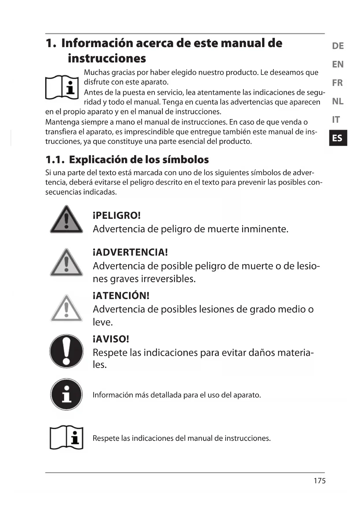 instrucciones Muchas gracias por haber elegido nuestro producto. Le deseamos que disfrute con este aparato. Antes de la puesta en servicio, lea atentamente las indicaciones de segu- ridad y todo el manual. Tenga en cuenta las advertencias que aparecen en el propio aparato y en el manual de instrucciones. Mantenga siempre a mano el manual de instrucciones. En caso de que venda o transfiera el aparato, es imprescindible que entregue también este manual de ins- trucciones, ya que constituye una parte esencial del producto. 1.1. Explicación de los símbolos Si una parte del texto está marcada con uno de los siguientes símbolos de adver- tencia, deberá evitarse el peligro descrito en el texto para prevenir las posibles con- secuencias indicadas. ¡PELIGRO! Advertencia de peligro de muerte inminente. ¡ADVERTENCIA! Advertencia de posible peligro de muerte o de lesio- nes graves irreversibles. ¡ATENCIÓN! Advertencia de posibles lesiones de grado medio o leve. ¡AVISO! Respete las indicaciones para evitar daños materia- les. Información más detallada para el uso del aparato. Respete las indicaciones del manual de instrucciones.176 ¡ADVERTENCIA! Advertencia de peligro por descarga eléctrica. ¡ADVERTENCIA! Advertencia de peligro por volumen excesivo. Clase de protección II Los aparatos eléctricos de la clase de protecciónII son aparatos que disponen de un aislamiento doble o reforzado continuo y que no tienen posibilidad de conexión de un conductor de puesta a tierra. La carcasa de un aparato eléctrico aislado con material aislante de la clase de protecciónII puede constituir total o parcialmente el aisla- miento adicional o reforzado. Uso en interiores Los aparatos con este símbolo solo son aptos para su uso en interio- res. Símbolo de corriente continua. Símbolo de corriente alterna. Marcado CE Los productos marcados con este símbolo cumplen los requisitos de las directivas de la UE (véase el capítulo «Información de conformi- dad»). Fabricado con la correspondiente licencia de Dolby Laboratories. Dolby, Dolby Vision, Dolby Atmos y el símbolo de la doble D son marcas registradas de Dolby Laboratories. El logotipo HDMI, así como High-Definition Multimedia Interface, son marcas registradas de HDMI Licensing LLC.