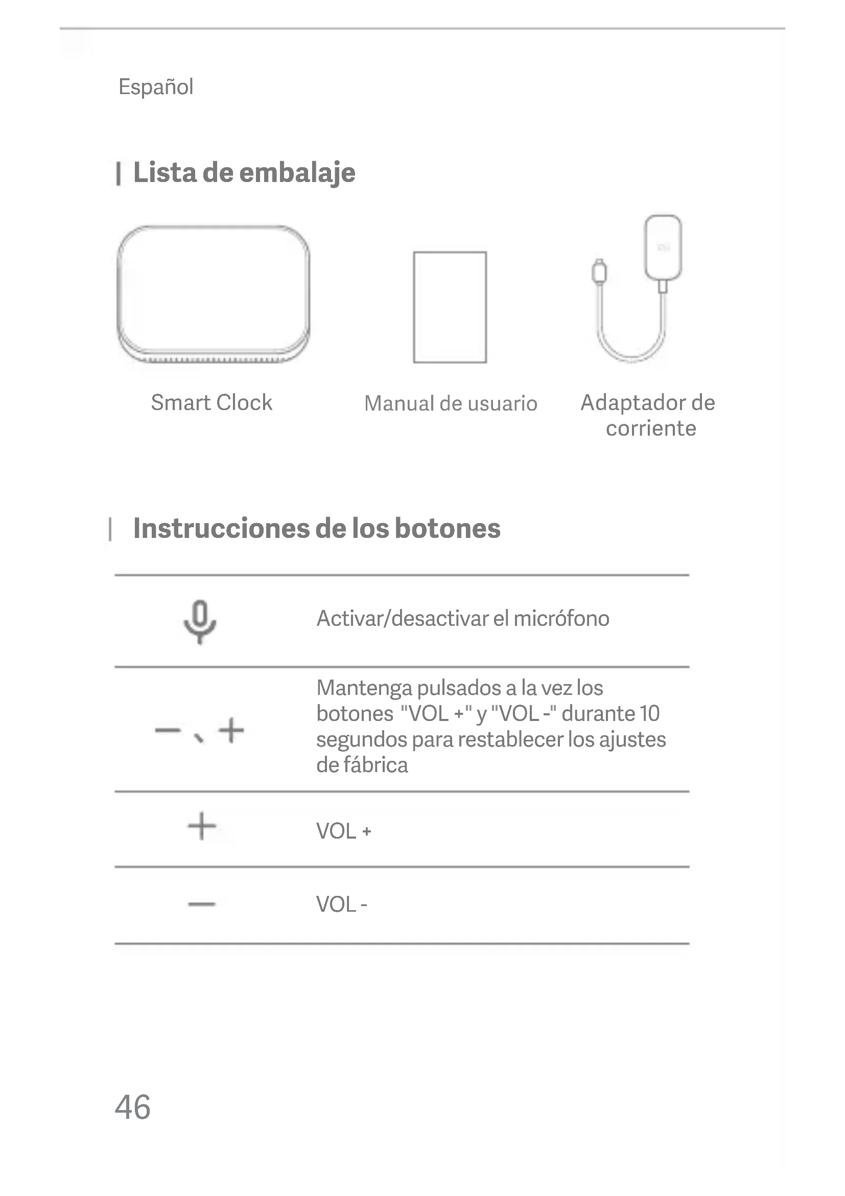 Español Con Android™ 5.0 o superior. Compatible con redes WiFi de 2,4GHz (las redes empresariales WPA-2 no sirven). Todos los ajustes y controles durante el proceso de configuración se realizan a través de la aplicación Google Home, por lo que tendrá que descargarla en su teléfono o tablet. Acceda a la tienda de aplicaciones de su dispositivo. Para los dispositivos iOS es la App Store y para los dispositivos Android, Google Play Store. En la tienda, busque Google Home y, cuando encuentre la aplicación correcta, descárguela e instálela. Ahora que dispone del soware necesario, es el momento de configurar el hardware. Tome el adaptador de corriente incluido en el embalaje del dispositivo y conéctelo al puerto. A continuación, enchufe el otro extremo del cable a una toma de corriente de la pared. Español La aplicación Google Home iniciará un tutorial que le mostrará los pasos de configuración básicos que debe seguir. Desplácese por ellos y siga las instrucciones para configurar su Mi Smart Clock. Configure sus propias alarmas. Además, puede consultar el tiempo, ver su calendario, obtener información sobre desplazamientos, leer noticias y mucho más; y todo ello solo con su voz. Descanse al caer la tarde: Pida a Google que apague las luces, cierre con llave las puertas y reproduzca música relajante mientras se prepara para dormir. También puede ver sugerencias de alarmas y configurarlas con el control táctil o la voz. Controle su hogar conectado: Utilice la voz para controlar sus dispositivos domésticos inteligentes. Encienda las luces, ajuste el termostato, compruebe su cámara de seguridad y mucho más; solo tiene que decir "Hey Google". para empezar. Disfrute de su música favorita: Pídale a Google que reproduzca su música y emisoras de radio favoritas. Mi Smart Clock también funciona con Chromecast, por lo que puede enviar sus películas, vídeos y canciones favoritas al televisor o los altavoces mediante la voz. Hable con Google a través de Mi Smart Clock para configurar una alarma, disfrutar de música, consultar la hora de su próxima reunión, controlar su hogar inteligente y mucho más; y todo ello sin necesidad de usar las manos. Español Español Español Entrada 5V 2A Conexión inalámbrica WiFi de 2,4GHz y norma IEEE 802.11b/g/n Nombre Mi Smart Clock Modelo X04G Altavoz Altavoz de espectro completo de 1,5” Pantalla 3,97” Micrófonos Matriz de 2micrófonos Bluetooth BT4.2 y A2DP Especificaciones técnicas