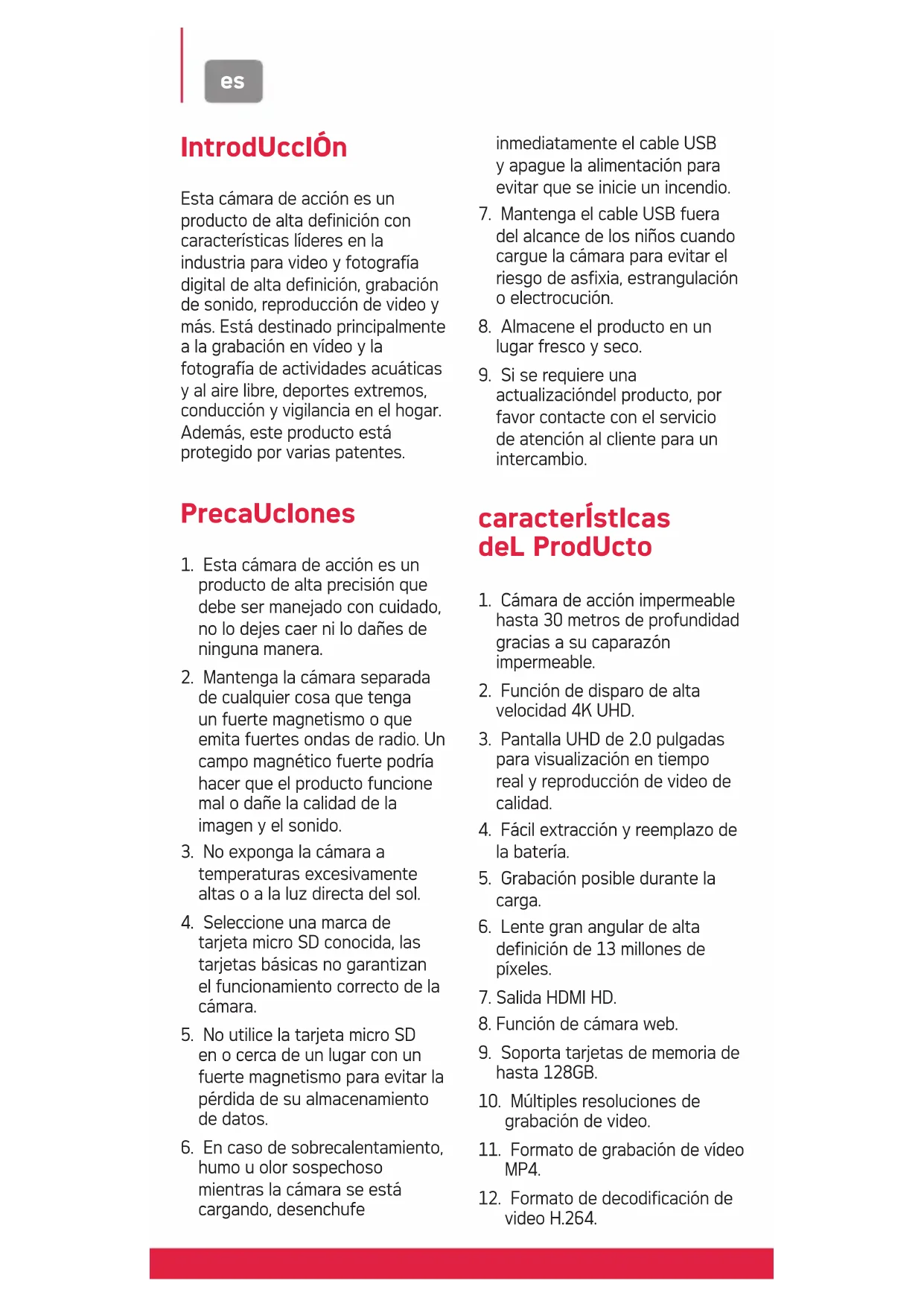 Lente 170 grados A + lente gran angular de alta resolución Idiomas Inglés/Francés/Alemán/Español/Italiano/ Portugués/Holandés/Polaco/ Húngaro/Checo/Ruso Resolución de vídeo 4K (3840 x 2160) 30fps 2.7K (2704 x 1520) 30fps 1440P (1920 x 1440) 60fps/30fps 1080P (1920 x 1080) 60fps/30fps 720P (1280 x 720) 120fps/60fps/30fps Formato de vídeo MP4 Formatos de compresión de vídeo H.265/H.264 Resolución de la foto 20M/12M/8M/5M/3M Medio de almacenamiento Micro SD(TF) Modo de rodaje Captura única/Temporizador (3/5/10/20 segundos) Frecuencia de la fuente de luz 50Hz/60Hz Puerto USB