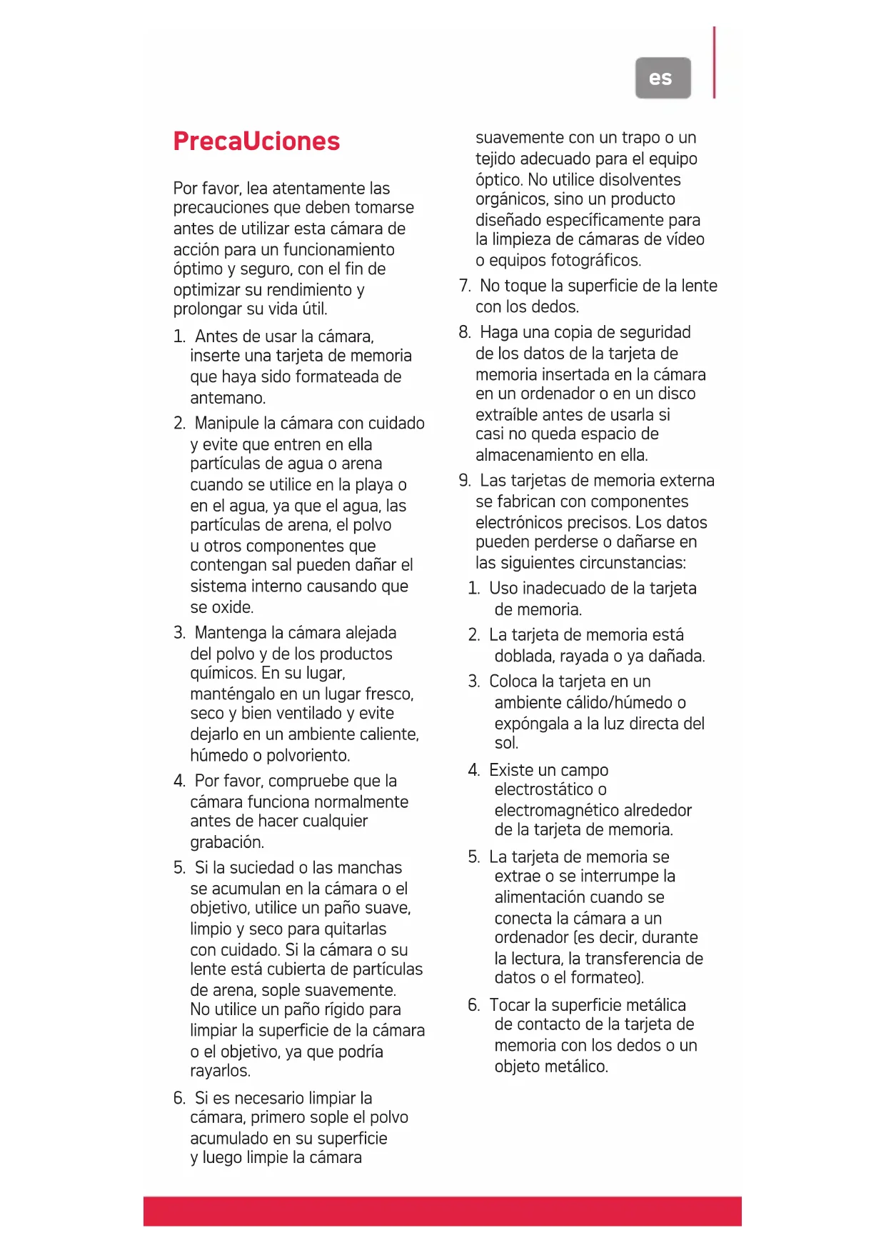 se acumulan en la cámara o el objetivo, utilice un paño suave, limpio y seco para quitarlas con cuidado. Si la cámara o su lente está cubierta de partículas de arena, sople suavemente. No utilice un paño rígido para limpiar la superficie de la cámara o el objetivo, ya que podría rayarlos.