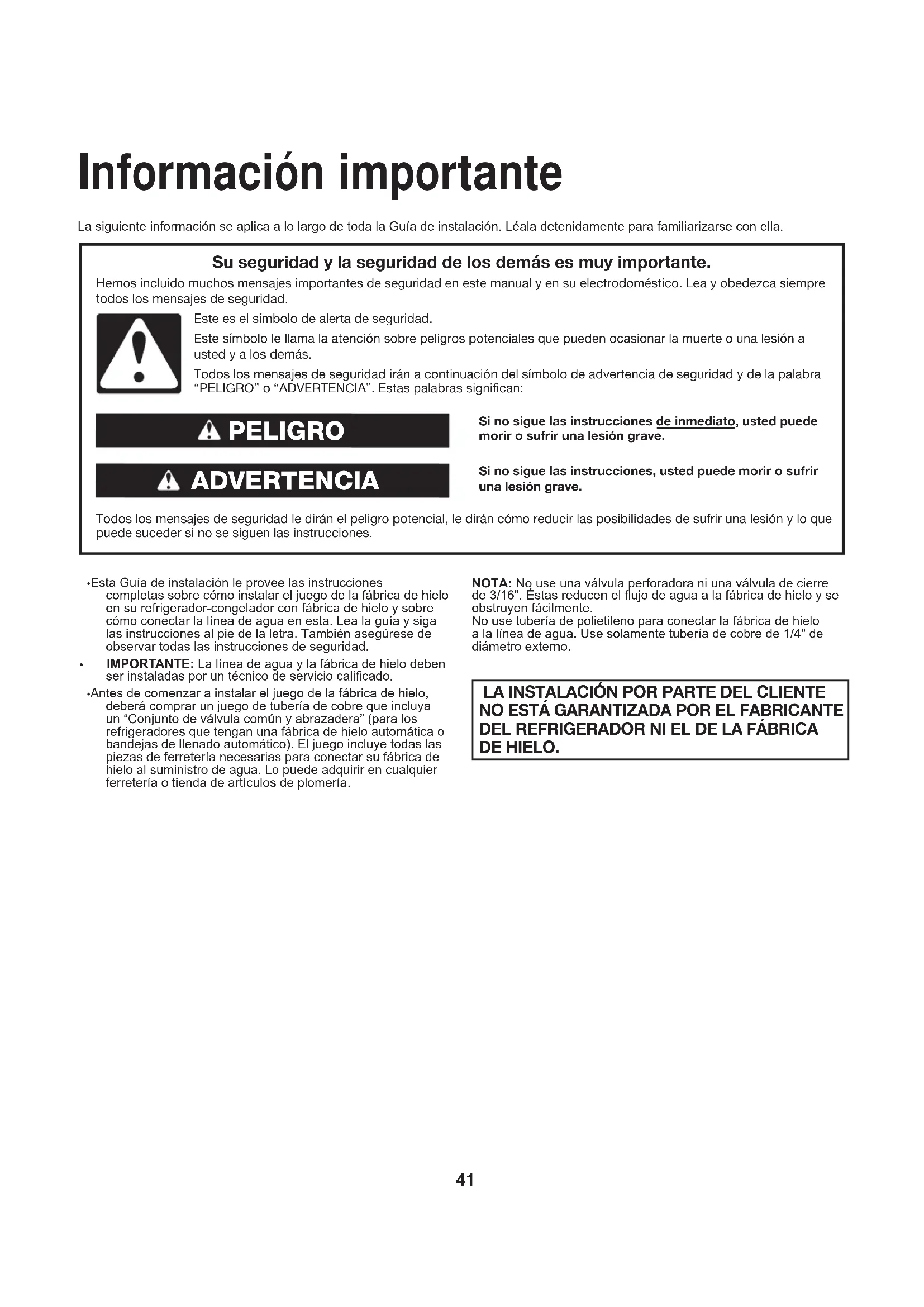 - Antes de comenzar a instalar el juego de la fábrica de hielo, deberá comprar un juego de tubería de cobre que incluya un “Conjunto de válvula común y abrazadera” (para los refrigeradores que tengan una fábrica de hielo automática o bandejas de llenado automático). El juego incluye todas las piezas de ferretería necesarias para conectar su fábrica de hielo al suministro de agua. Lo puede adquirir en cualquier ferretería o tienda de artículos de plomería. NOTA: No use una válvula perforadora ni una válvula de cierre de 3/16". Éstas reducen el ujo de agua a la fábrica de hielo y se obstruyen fácilmente. No use tubería de polietileno para conectar la fábrica de hielo a la línea de agua. Use solamente tubería de cobre de 1/4" de diámetro externo. LA INSTALACIÓN POR PARTE DEL CLIENTE