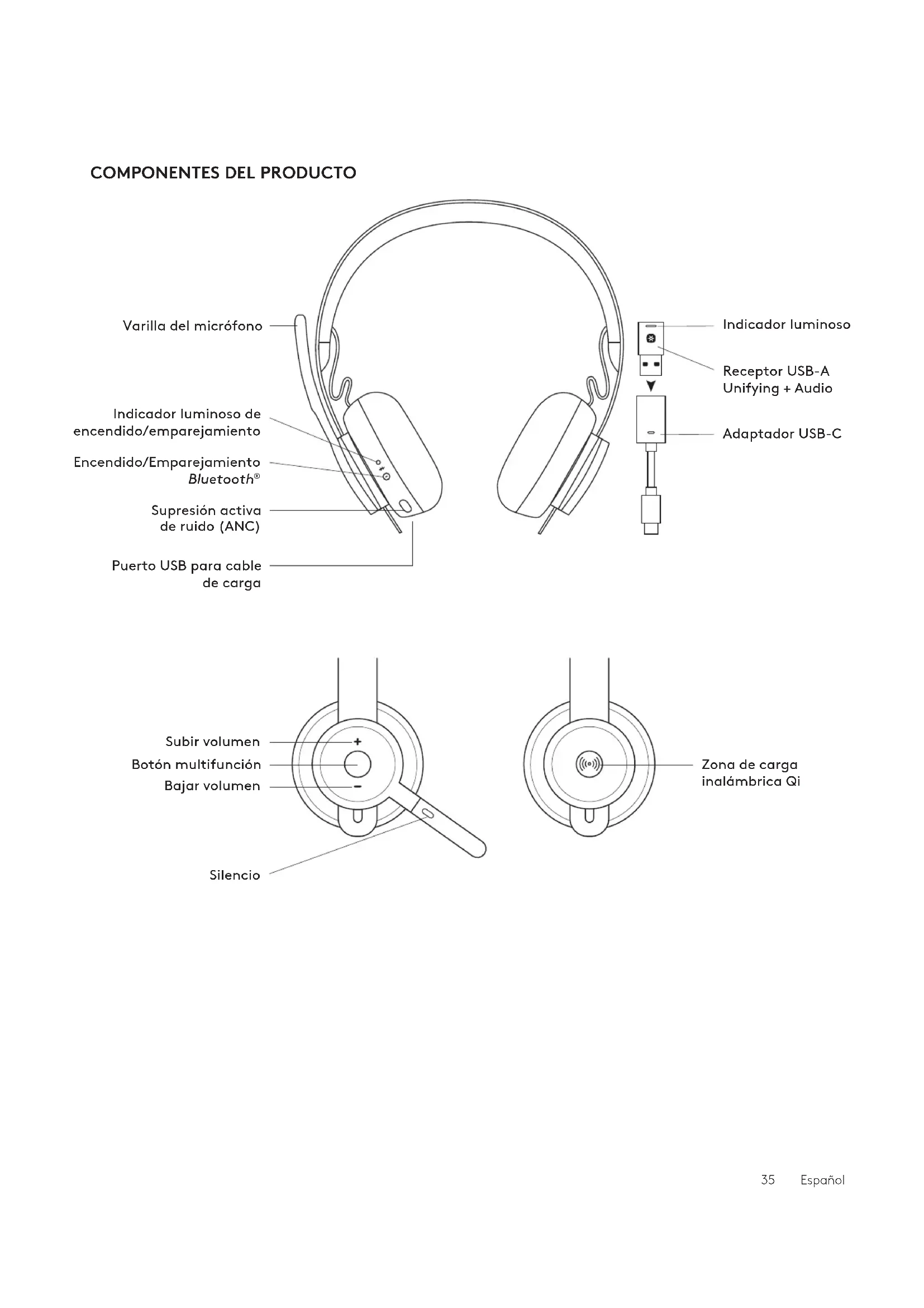 SPECIFICHE TECNICHE www.logitech.com/support/zone900COMPONENTES DEL PRODUCTO Varilla del micrófono Indicador luminoso de encendido/emparejamiento Supresión activa deruido (ANC) Encendido/Emparejamiento Bluetooth