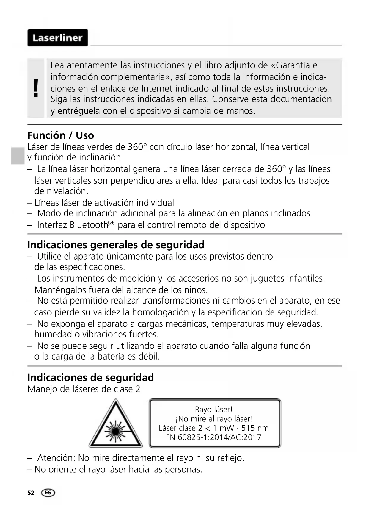 - para el control remoto del dispositivo Indicaciones generales de seguridad – Utilice el aparato únicamente para los usos previstos dentro de las especicaciones. – Los instrumentos de medición y los accesorios no son juguetes infantiles. Manténgalos fuera del alcance de los niños. – No está permitido realizar transformaciones ni cambios en el aparato, en ese caso pierde su validez la homologación y la especicación de seguridad. – No exponga el aparato a cargas mecánicas, temperaturas muy elevadas, humedad o vibraciones fuertes. – No se puede seguir utilizando el aparato cuando falla alguna función o la carga de la batería es débil. Rayo láser! ¡No mire al rayo láser! Láser clase 2 < 1 mW · 515 nm EN 60825-1:2014/AC:2017 Indicaciones de seguridad Manejo de láseres de clase 2 – Atención: No mire directamente el rayo ni su reejo. – No oriente el rayo láser hacia las personas. ESCompactLine-Laser G360