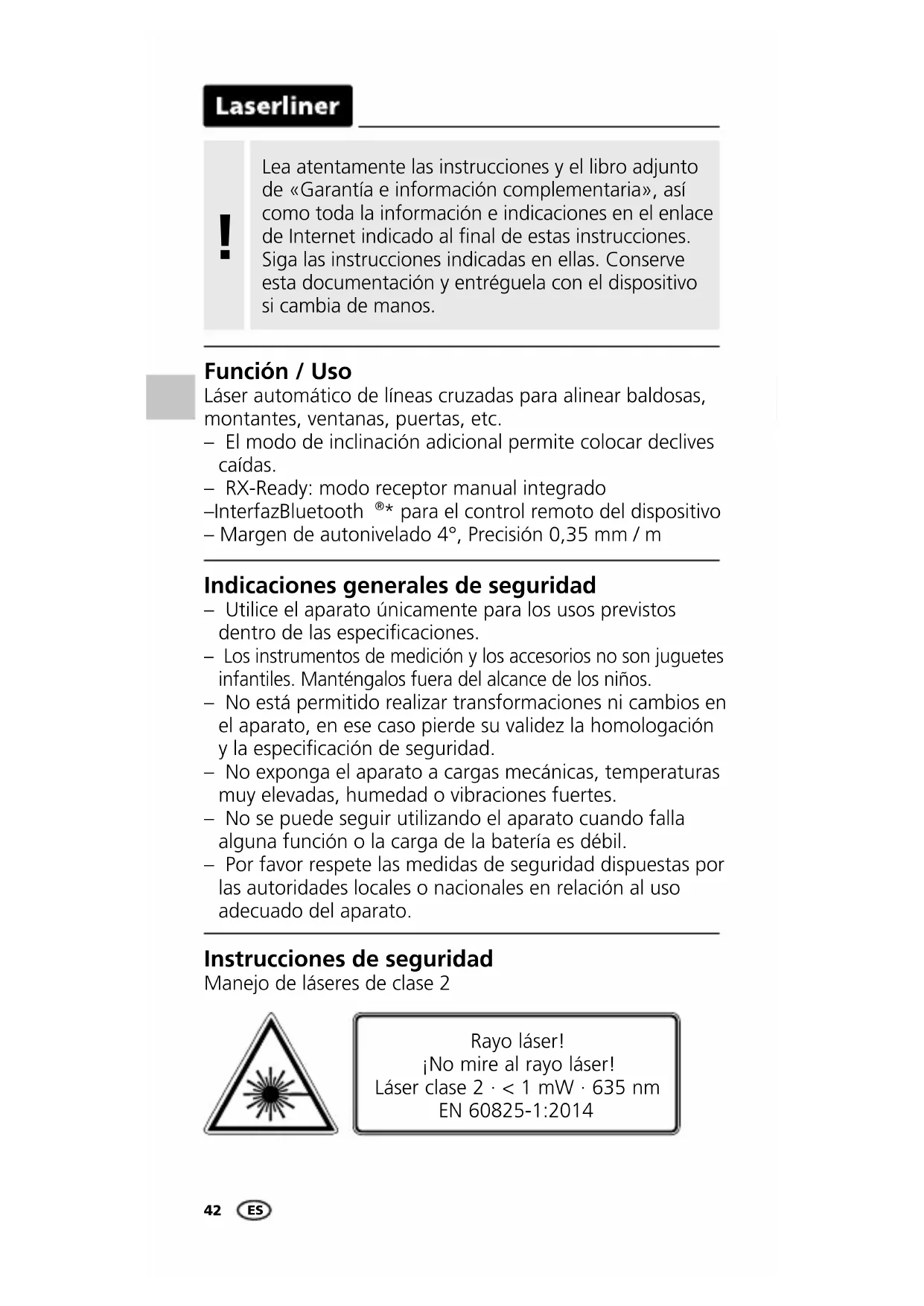 - para el control remoto del dispositivo – Margen de autonivelado 4°, Precisión 0,35 mm / m Indicaciones generales de seguridad – Utilice el aparato únicamente para los usos previstos dentro de las especicaciones. – Los instrumentos de medición y los accesorios no son juguetes infantiles. Manténgalos fuera del alcance de los niños. – No está permitido realizar transformaciones ni cambios en el aparato, en ese caso pierde su validez la homologación y la especicación de seguridad. – No exponga el aparato a cargas mecánicas, temperaturas muy elevadas, humedad o vibraciones fuertes. – No se puede seguir utilizando el aparato cuando falla alguna función o la carga de la batería es débil. – Por favor respete las medidas de seguridad dispuestas por las autoridades locales o nacionales en relación al uso adecuado del aparato. Instrucciones de seguridad Manejo de láseres de clase 2 Lea atentamente las instrucciones y el libro adjunto de «Garantía e información complementaria», así como toda la información e indicaciones en el enlace de Internet indicado al final de estas instrucciones. Siga las instrucciones indicadas en ellas. Conserve esta documentación y entréguela con el dispositivo si cambia de manos.