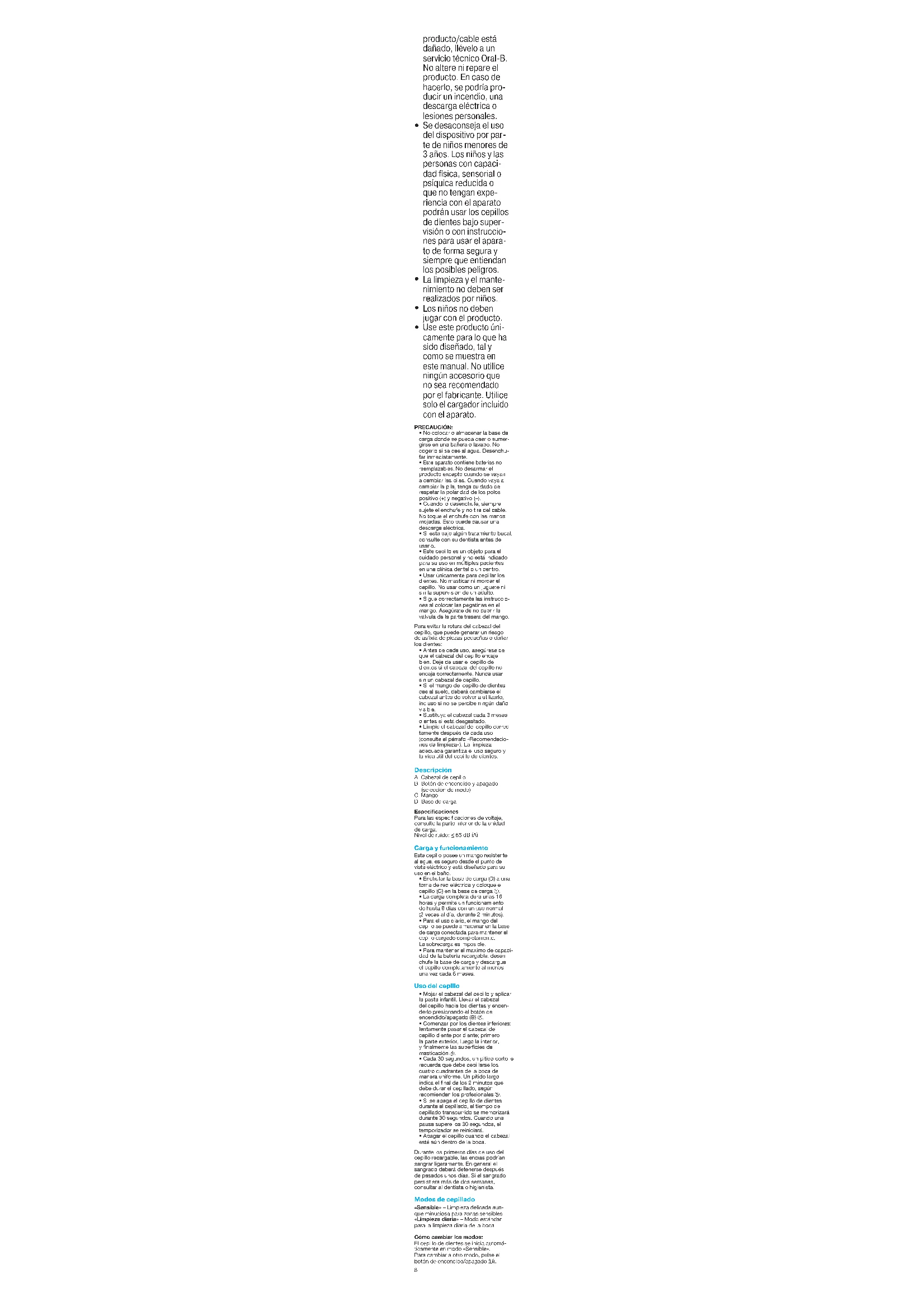Sujeto a cambio sin previo aviso. Medio ambiente Este producto contiene baterías y/o materiales eléctricos reciclables. Para proteger el medio ambiente, se recomienda no tirarlo a la basura. Es posible depositarlo en los espacios especiales de reciclado disponibles en cada país. Garantía Aseguramos 2 años de garantía desde el día de la compra del producto. Dentro del período de garantía solu- cionaremos sin ningún cargo cualquier defecto resultante de fallos en el material y / o en la fabricación. Esto lo haremos, dependiendo del caso, reparando la unidad o reemplazándola por una nueva. Esta garantía es apli- cable a todos los países en los que se vendan los productos Braun. La disponibilidad de una unidad de repuesto puede tener como resultado un color diferente o un modelo equiva- lente. Esta garantía no cubre los des perfectos causados en los siguien- tes casos: Uso inapropiado, desgaste normal por uso, o uso negligente del mismo. La garantía se invalida si la reparación es llevada a cabo por personas no auto-rizadas o por el uso de elemen- tos que no sean Braun. Para acceder al servicio durante el período de garantía, por favor entre- gue o envíe su cepillo completo así como la factura a un servicio post-venta autorizado Oral-B Braun. Para poder hacer uso de la garantía durante el periodo establecido, con- serve o envíe el ticket de compra a un servicio post-venta autorizado Oral-B Braun. Garantía de sustitución de los cabezales La garantía de Oral-B quedará anulada si el daño del cepillo recargable se debe al uso de cabezales de recambio que no son Oral-B. Oral-B no aconseja el uso de cabezales de recambio que no sean Oral-B.