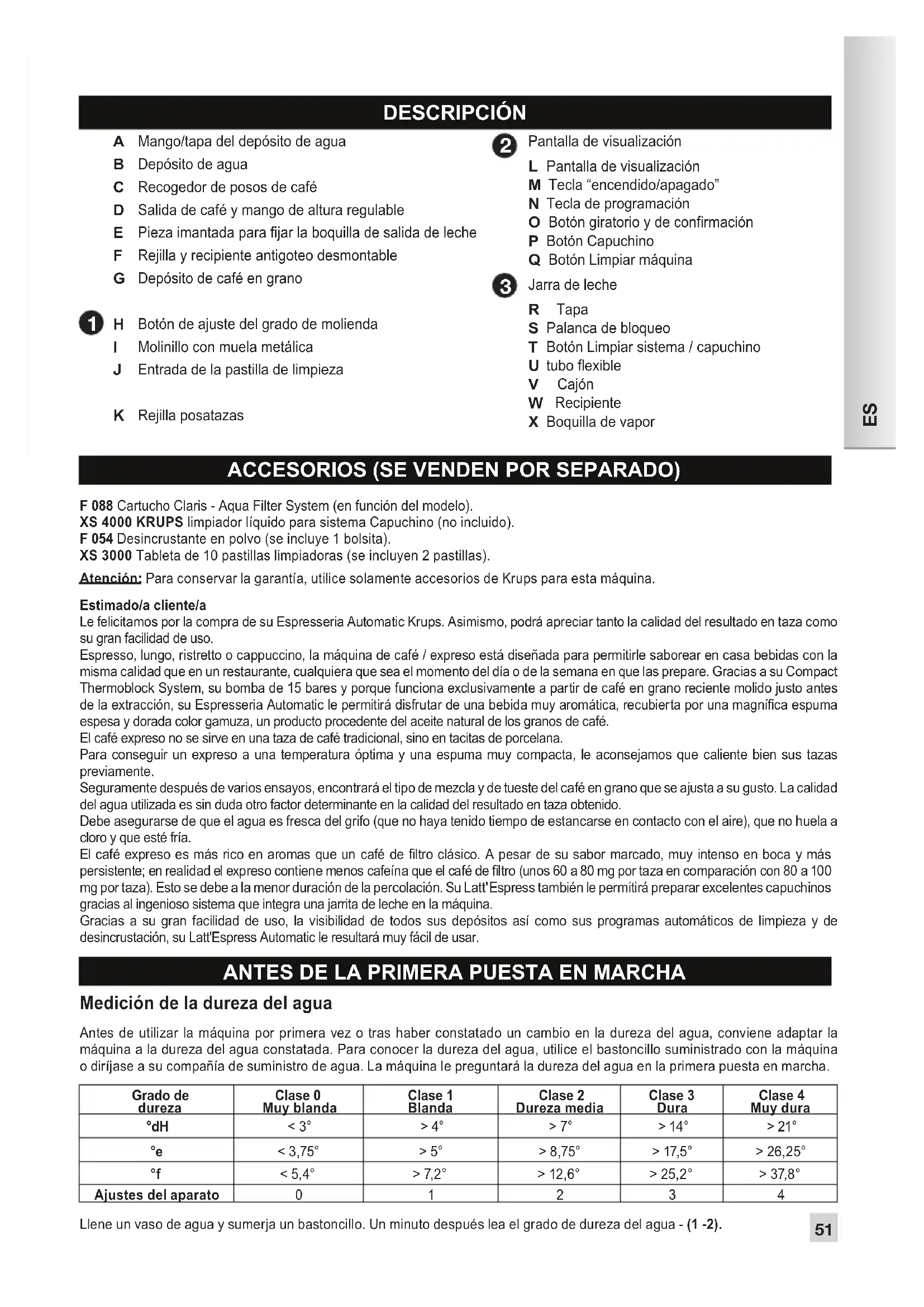 Boquilla de vapor ACCESORIOS (SE VENDEN POR SEPARADO) F 088 Cartucho Claris - Aqua Filter System (en función del modelo). XS 4000 KRUPS limpiador líquido para sistema Capuchino (no incluido). F 054 Desincrustante en polvo (se incluye 1 bolsita). XS 3000 Tableta de 10 pastillas limpiadoras (se incluyen 2 pastillas). Atención: Para conservar la garantía, utilice solamente accesorios de Krups para esta máquina. Estimado/a cliente/a Le felicitamos por la compra de su Espresseria Automatic Krups. Asimismo, podrá apreciar tanto la calidad del resultado en taza como su gran facilidad de uso. Espresso, lungo, ristretto o cappuccino, la máquina de café / expreso está diseñada para permitirle saborear en casa bebidas con la misma calidad que en un restaurante, cualquiera que sea el momento del día o de la semana en que las prepare. Gracias a su Compact Thermoblock System, su bomba de 15 bares y porque funciona exclusivamente a partir de café en grano reciente molido justo antes de la extracción, su Espresseria Automatic le permitirá disfrutar de una bebida muy aromática, recubierta por una magníca espuma espesa y dorada color gamuza, un producto procedente del aceite natural de los granos de café. El café expreso no se sirve en una taza de café tradicional, sino en tacitas de porcelana. Para conseguir un expreso a una temperatura óptima y una espuma muy compacta, le aconsejamos que caliente bien sus tazas previamente. Seguramente después de varios ensayos, encontrará el tipo de mezcla y de tueste del café en grano que se ajusta a su gusto. La calidad del agua utilizada es sin duda otro factor determinante en la calidad del resultado en taza obtenido. Debe asegurarse de que el agua es fresca del grifo (que no haya tenido tiempo de estancarse en contacto con el aire), que no huela a cloro y que esté fría. El café expreso es más rico en aromas que un café de ltro clásico. A pesar de su sabor marcado, muy intenso en boca y más persistente; en realidad el expreso contiene menos cafeína que el café de ltro (unos 60 a 80 mg por taza en comparación con 80 a 100 mg por taza). Esto se debe a la menor duración de la percolación. Su Latt'Espress también le permitirá preparar excelentes capuchinos gracias al ingenioso sistema que integra una jarrita de leche en la máquina. Gracias a su gran facilidad de uso, la visibilidad de todos sus depósitos así como sus programas automáticos de limpieza y de desincrustación, su Latt'Espress Automatic le resultará muy fácil de usar. ANTES DE LA PRIMERA PUESTA EN MARCHA Medición de la dureza del agua Antes de utilizar la máquina por primera vez o tras haber constatado un cambio en la dureza del agua, conviene adaptar la máquina a la dureza del agua constatada. Para conocer la dureza del agua, utilice el bastoncillo suministrado con la máquina o diríjase a su compañía de suministro de agua. La máquina le preguntará la dureza del agua en la primera puesta en marcha. Grado de dureza Clase 0 Muy blanda Clase 1 Blanda Clase 2 Dureza media Clase 3 Dura Clase 4 Muy dura °dH < 3° > 4° > 7° > 14° > 21° °e < 3,75° > 5° > 8,75° > 17,5° > 26,25° °f < 5,4° > 7,2 ° > 12,6° > 25,2° > 37,8° Ajustes del aparato 0 1 2 3 4 Llene un vaso de agua y sumerja un bastoncillo. Un minuto después lea el grado de dureza del agua - (1 -2).