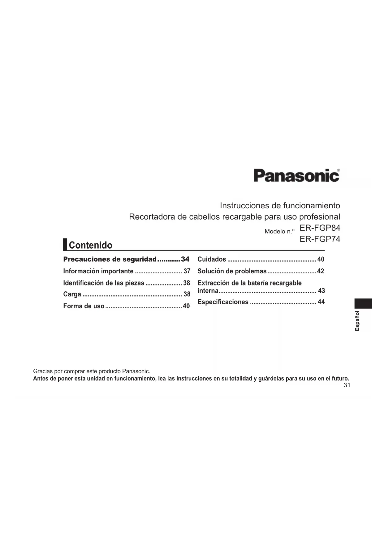 - Español Especicaciones Fuente de energía Anote el número de placa que se encuentra en el adaptador de CA. (Conversión de voltaje automática) Voltaje del motor 3,6 V Tiempo de carga Aprox. 1 hora Para más información sobre la eciencia energética del producto, visite nuestra página web, www.panasonic.com, e introduzca el número de modelo en la máscara de búsqueda. Eliminación de Aparatos Viejos y de Pilas y Baterías Solamente para la Unión Europea y países con sistemas de reciclado Estos símbolos en los productos, su embalaje o en los documentos que los acompañen signican que los productos eléctricos y electrónicos y pilas y baterías usadas no deben mezclarse con los residuos domésticos. Para el adecuado tratamiento, recuperación y reciclaje de los productos viejos y pilas y baterías usadas llévelos a los puntos de recogida de acuerdo con su legislación nacional. En España, los usuarios están obligados a entregar las pilas en los correspondientes puntos de recogida. En cualquier caso, la entrega por los usuarios será sin coste alguno para éstos. El coste de la gestión medioambiental de los residuos de pilas y baterías está incluido en el precio de venta. Si los elimina correctamente ayudará a preservar valiosos recursos y evitará potenciales efectos negativos sobre la salud de las personas y sobre el medio ambiente. Para más información sobre la recogida u reciclaje, por favor contacte con su ayuntamiento. Puede haber sanciones por una incorrecta eliminación de este residuo, de acuerdo con la legislación nacional. Nota para el símbolo de pilas y baterías (símbolo debajo) Este símbolo puede usarse en combinación con el símbolo químico. En este caso, cumple con los requisitos de la Directiva del producto químico indicado.45 Nederlands Gebruiksaanwijzing Tondeuse op wisselstroom/oplaadbaar voor professioneel gebruik Model Nr. ER‑FGP84 ER‑FGP74 Hartelijk dank voor uw aankoop van dit Panasonic product. Lees voor gebruik van dit apparaat deze instructies en bewaar ze om ze later te raadplegen. Veiligheidsmaatregelen p. 48