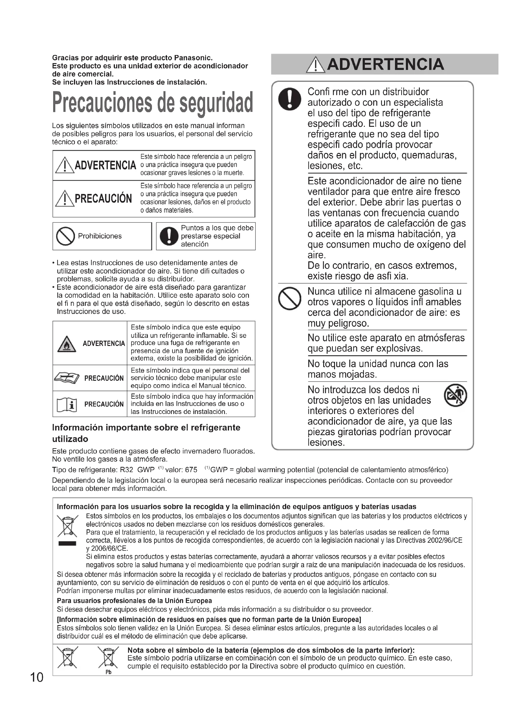 01320982all.indb901320982all.indb9 2020/06/2911:10:562020/06/2911:10:5610 Gracias por adquirir este producto Panasonic.Este producto es una unidad exterior de acondicionador de aire comercial.Se incluyen las Instrucciones de instalación. Precauciones de seguridad Los siguientes símbolos utilizados en este manual informan de posibles peligros para los usuarios, el personal del servicio técnico o el aparato: ADVERTENCIA Este símbolo hace referencia a un peligro o una práctica insegura que pueden ocasionar graves lesiones o la muerte. PRECAUCIÓN Este símbolo hace referencia a un peligro o una práctica insegura que pueden ocasionar lesiones, daños en el producto o daños materiales.ProhibicionesPuntos a los que debe prestarse especial atención• Lea estas Instrucciones de uso detenidamente antes de utilizar este acondicionador de aire. Si tiene difi cultades o problemas, solicite ayuda a su distribuidor.• Este acondicionador de aire está diseñado para garantizar la comodidad en la habitación. Utilice este aparato solo con el fi n para el que está diseñado, según lo descrito en estas Instrucciones de uso. Confi rme con un distribuidor autorizado o con un especialista el uso del tipo de refrigerante especifi cado. El uso de un refrigerante que no sea del tipo especifi cado podría provocar daños en el producto, quemaduras, lesiones, etc. Este acondicionador de aire no tiene ventilador para que entre aire fresco del exterior. Debe abrir las puertas o las ventanas con frecuencia cuando utilice aparatos de calefacción de gas o aceite en la misma habitación, ya que consumen mucho de oxígeno del aire. De lo contrario, en casos extremos, existe riesgo de asfi xia. Nunca utilice ni almacene gasolina u otros vapores o líquidos infl amables cerca del acondicionador de aire: es muy peligroso. No utilice este aparato en atmósferas que puedan ser explosivas. No toque la unidad nunca con las manos mojadas. No introduzca los dedos ni otros objetos en las unidades interiores o exteriores del acondicionador de aire, ya que las piezas giratorias podrían provocar lesiones. ADVERTENCIA ADVERTENCIAEste símbolo indica que este equipo utiliza un refrigerante inflamable. Si se produce una fuga de refrigerante en presencia de una fuente de ignición externa, existe la posibilidad de ignición.PRECAUCIÓNEste símbolo indica que el personal del servicio técnico debe manipular este equipo como indica el Manual técnico.PRECAUCIÓNEste símbolo indica que hay información incluida en las Instrucciones de uso o las Instrucciones de instalación.Información importante sobre el refrigerante utilizadoEste producto contiene gases de efecto invernadero fluorados. No ventile los gases a la atmósfera.Tipo de refrigerante: R32 GWP (1) valor: 675 (1) GWP = global warming potential (potencial de calentamiento atmosférico) Dependiendo de la legislación local o la europea será necesario realizar inspecciones periódicas. Contacte con su proveedor local para obtener más información.Información para los usuarios sobre la recogida y la eliminación de equipos antiguos y baterías usadas